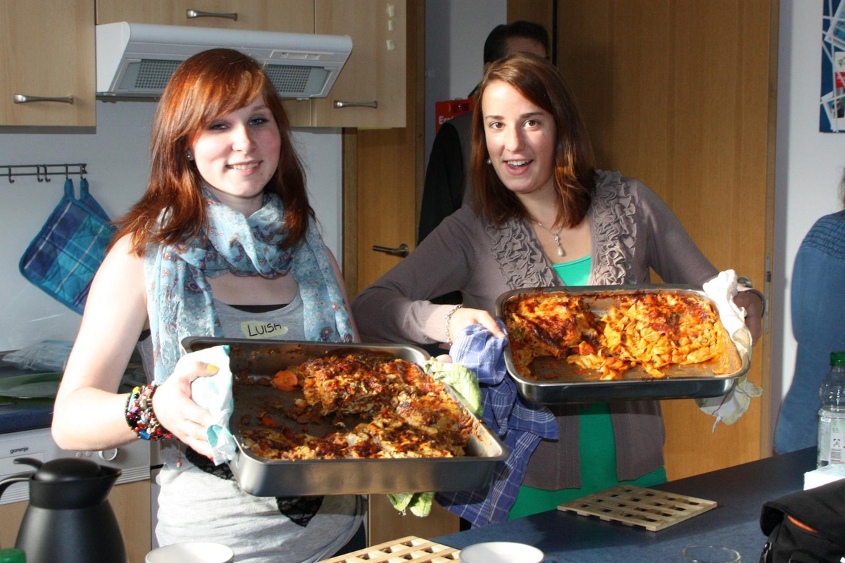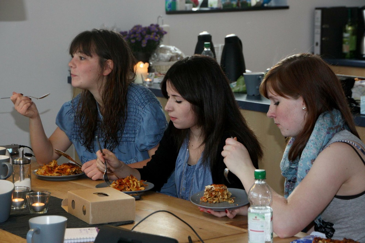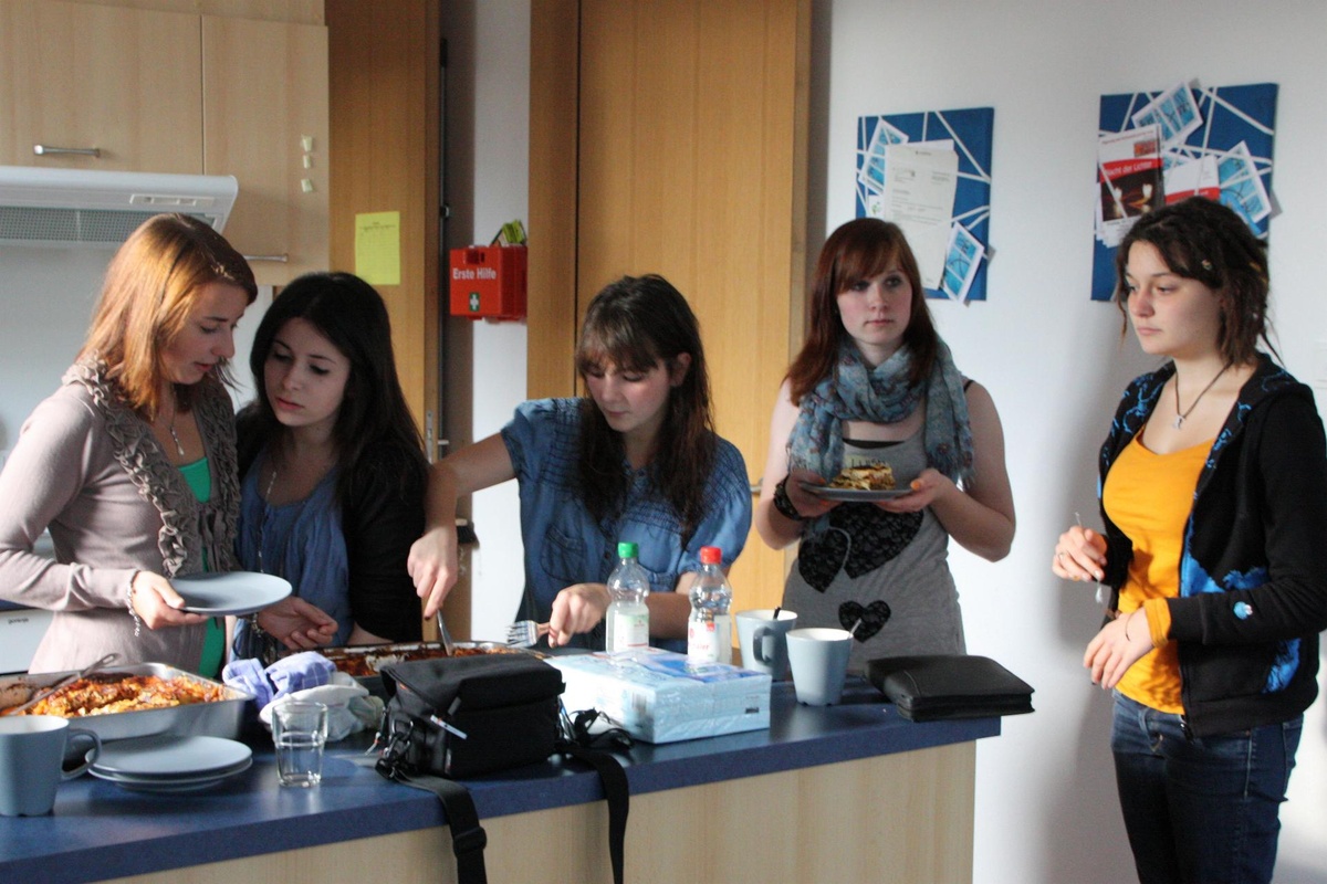 Da kommt die gemeinsam gekochte Lasagne von gestern Abend gerade recht. Wohngemeinschaftsalltag bei den acht jungen Frauen, die sich für vier Tage zu einer ungewöhnlichen Team zusammengerauft haben. Gemeinsam mit Andrea Karwath, der Integrationskoordinatorin des Stadtjugendrings und Jens Hausdörfer, dem Dekanatsjugendseelsorger in der katholischen Jugendarbeit für Aschaffenburg sind sie in eine interkulturelle WG gezogen. Interkulturell deshalb, weil vier der Bewohner elterliche Wurzeln außerhalb Deutschlands haben. Gizem und Aylin haben türkische, Caklin aramäische und Katharina russische Wurzeln. Rebecca, Lisa, Luisa und Hannah dagegen stammen von deutschen Eltern ab. Doch wären da nicht die anders klingenden Vornamen, man würde auf dem ersten Blick keine Herkunfts-Unterschiede feststellen. Und Lasagne, von Haus aus ja eigentlich ein italienisches Gericht, scheint die zwischen 16 und 22 Jahre alten Frauen sowieso alle zu einen.