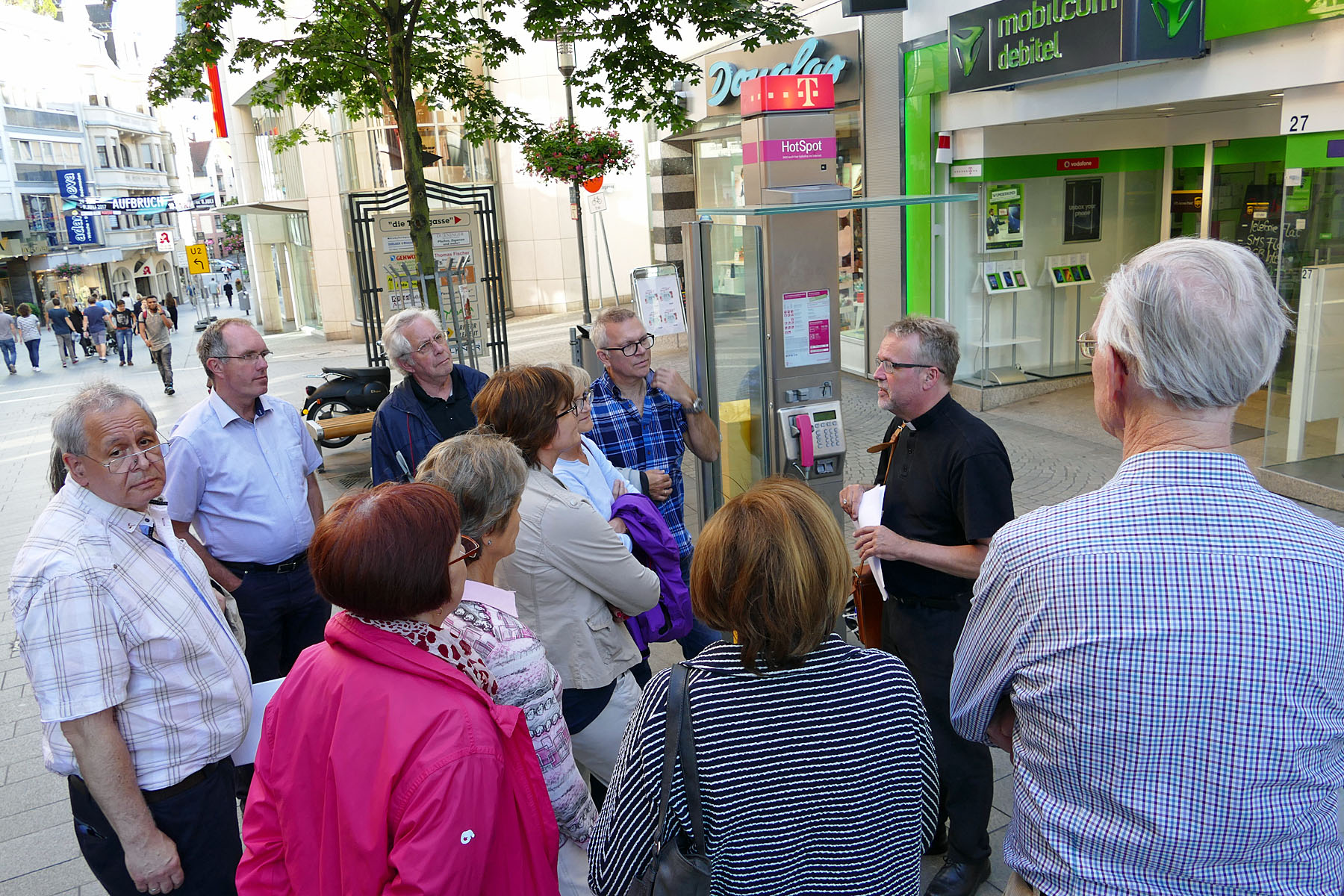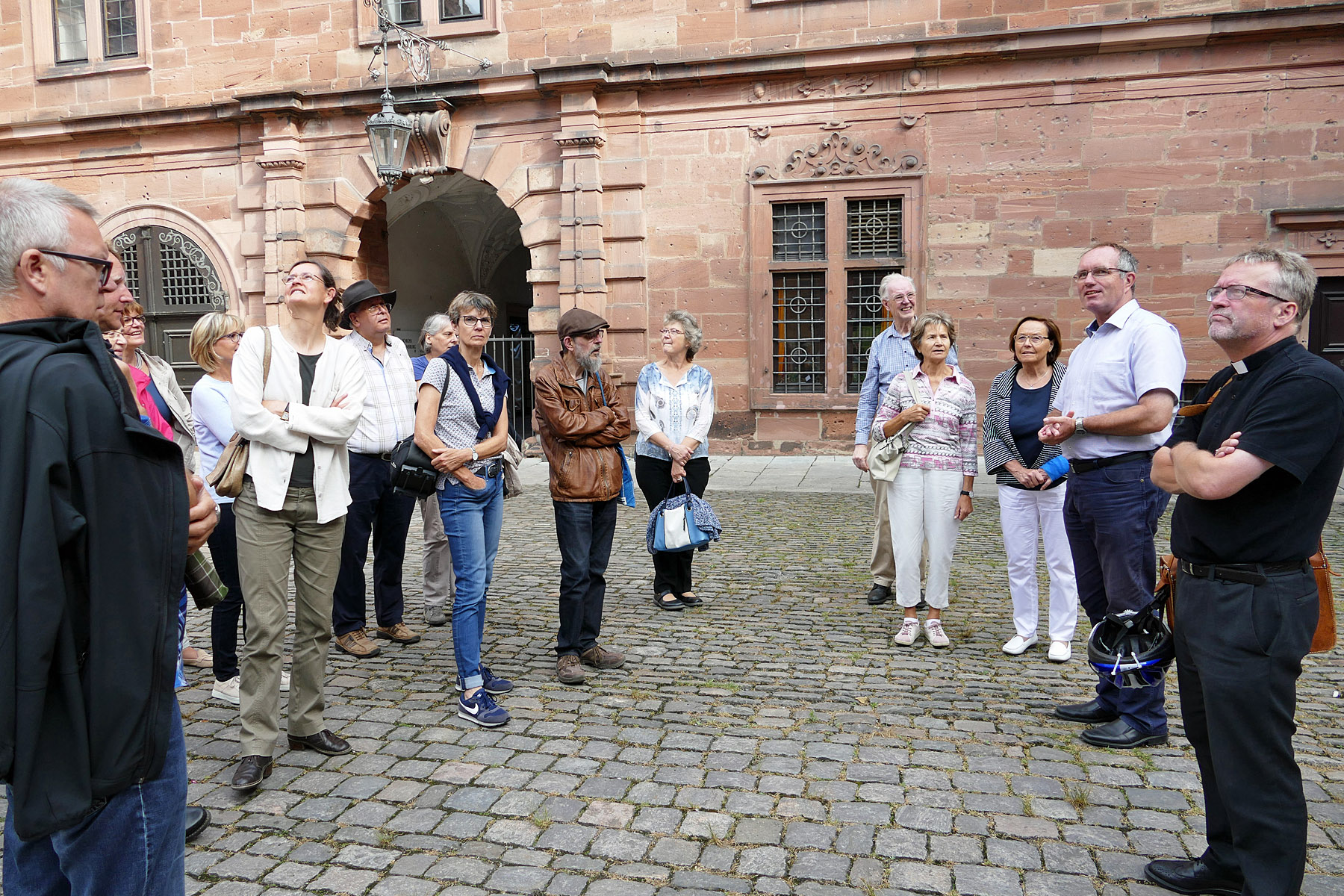 Aschaffenburg (POW) Auf eine „Ökumenische Schatzsuche in Aschaffenburg“ haben sich 16 Teilnehmer mit dem evangelisch-lutherischen Dekan Rudi Rupp, dem katholischen Dekan Wolfgang Kempf und Bildungsreferent Burkard Vogt gemacht. Bei einem Rundgang durch die Innenstadt am Freitag, 30. Juni, erzählten sie, wie der Glaube nach Aschaffenburg kam, wie sich die Konfessionen entwickelten und wie in den vergangenen Jahrzehnten über die Ökumene eine fruchtbare Partnerschaft entstanden ist. Zu der Veranstaltung hatten das Martinusforum Aschaffenburg und das Evangelische Bildungswerk Untermain eingeladen.