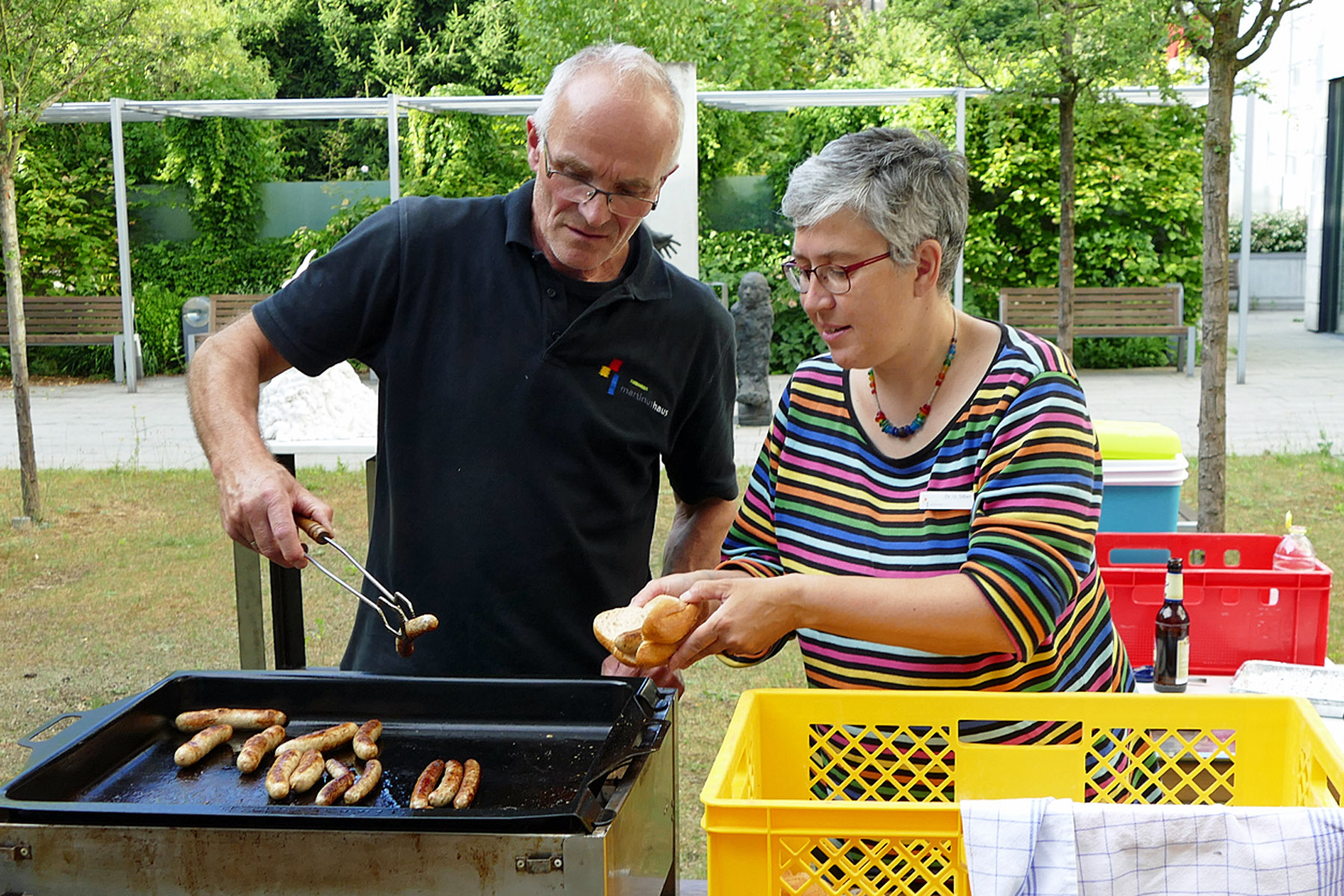 Beim Abschluss des Rundgangs im Innenhof des Martinushauses gaben beide Dekane ein kurzes Fazit zum Stand der Ökumene in Aschaffenburg. Für Kempf ist die Ökumene geprägt von viel Wohlwollen und Wissen voneinander. „Wir haben hier das Bewusstsein, dass unter den momentanen gesellschaftlichen Bedingungen kein Weg daran vorbeigeht, am gleichen Strang zu ziehen mit dem, was wir als Verkündigung des Evangeliums meinen.“ Dekan Rupp, zurzeit auch Vorsitzender der lokalen ACK, sah es für die Zukunft als wichtigen Schritt, den Ökumenegedanken noch stärker in die kleineren christlichen Gemeinschaften einzupflanzen. Ein Metzger hatte zudem „katholische“ und „evangelische“ Bratwürste gemacht. Man könne feststellen, so heißt es in einem Buch über die fränkische Bratwurst von Heinrich Höllerl, dass in den evangelischen Gegenden Frankens eher die grobe und mit Majoran gewürzte Wurst zu finden sei, während in den katholischen Gegenden eher die gebrühte Wurst verbreitet sei, die mit Zitrone und manchmal auch etwas Wein verfeinert werde.
