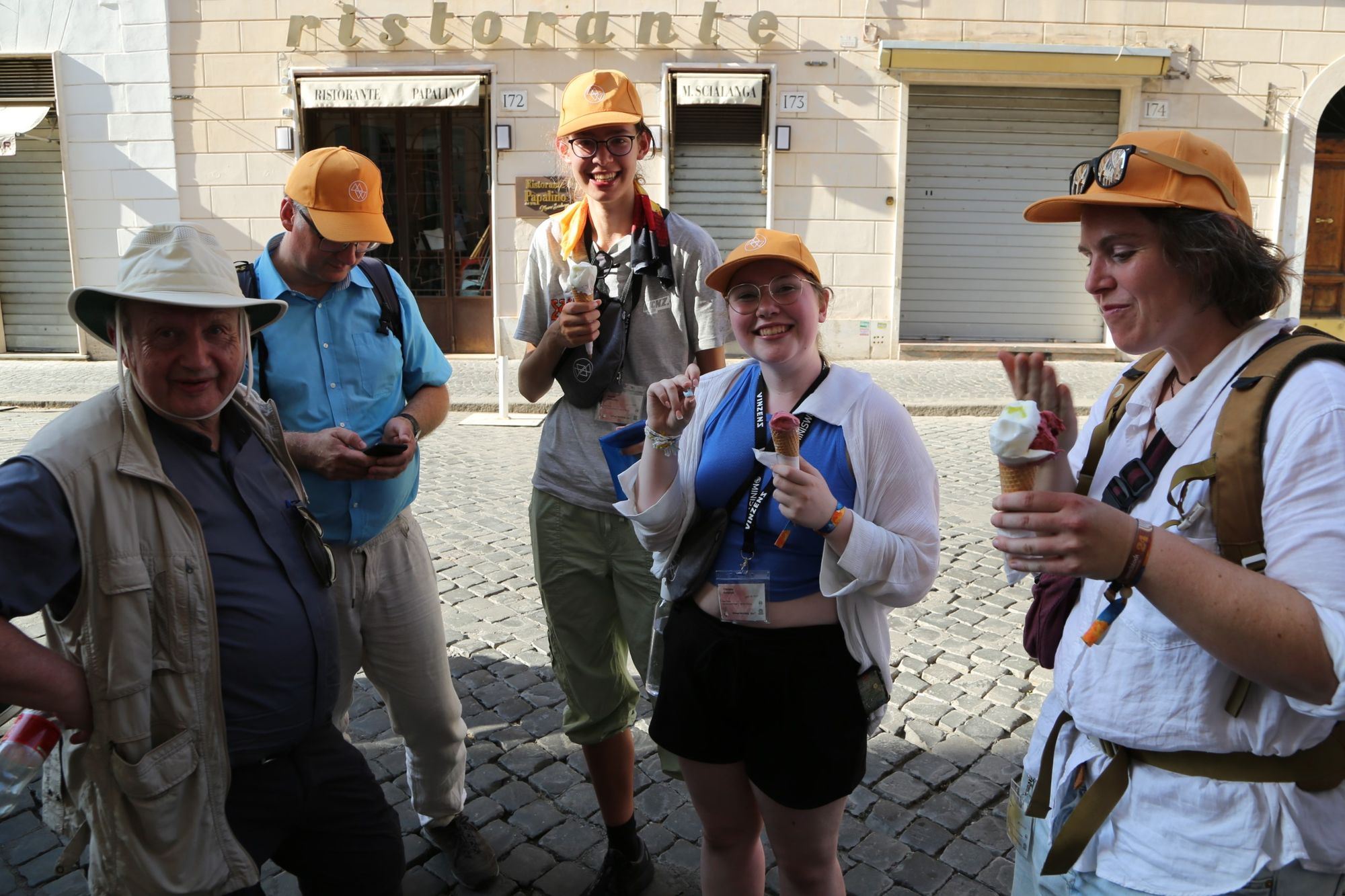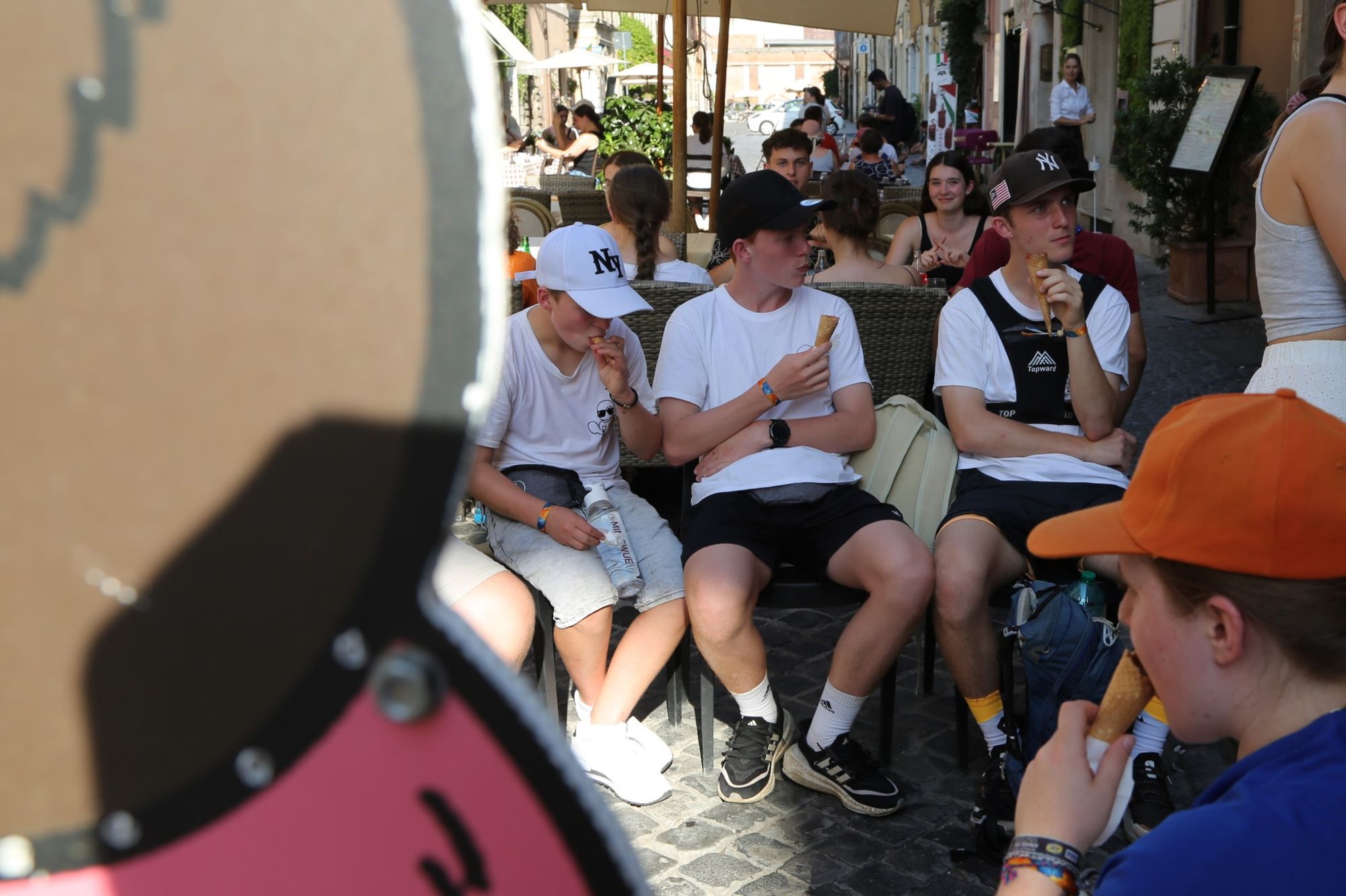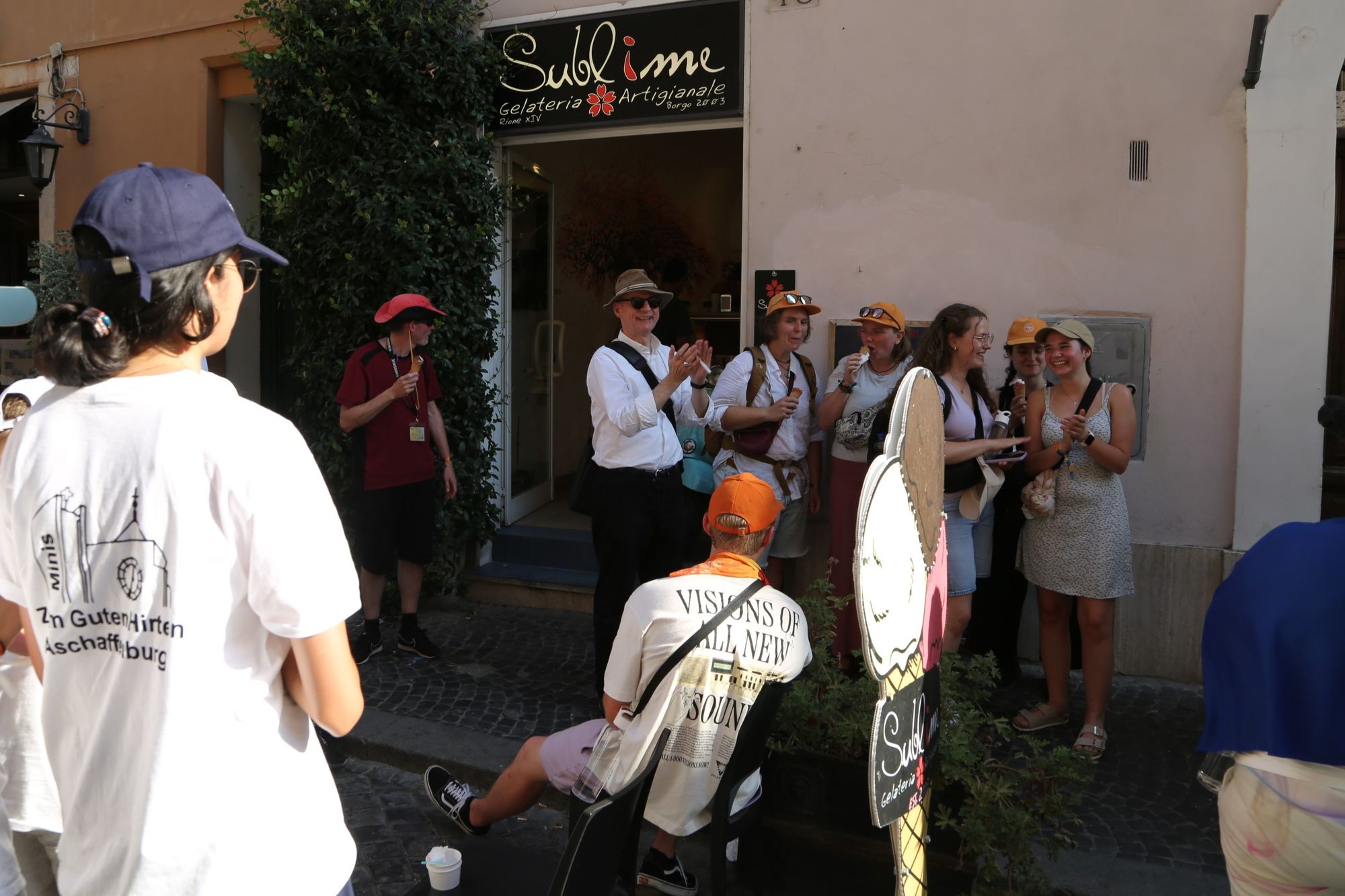 Für die Ministrantengruppe aus Aschaffenburg ist es der erste Tag der Romwallfahrt 2024. Am Montagmorgen sind sie nach einer Busfahrt über Nacht in der Ewigen Stadt angekommen. Der Bischof ist seit der Nacht auf Montag ebenfalls in der Stadt. Gleich für den ersten Tag steht nun ein gemeinsamer Ausflug an. Das Treffen hat die Aschaffenburger Gruppe über ein Gewinnspiel der Kirchlichen Jugendarbeit gewonnen. Und was kann man den Jugendlichen bei der römischen Hitze von fast 36 Grad Gutes tun? „Am besten ein Eis spendieren. Das hebt schon einmal die Stimmung und ist schön für den ersten Tag zur Begrüßung“, sagt Bischof Jung.
