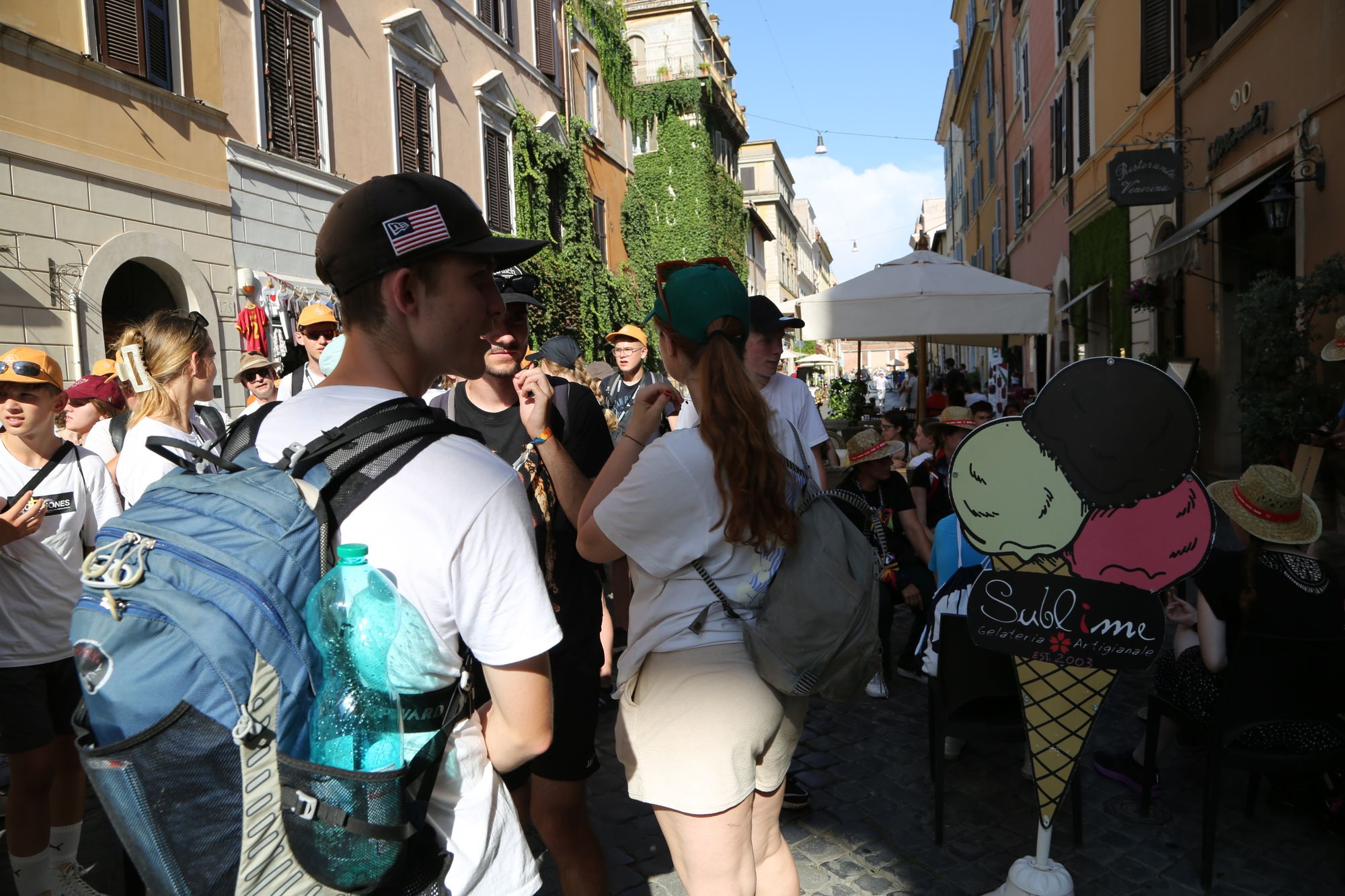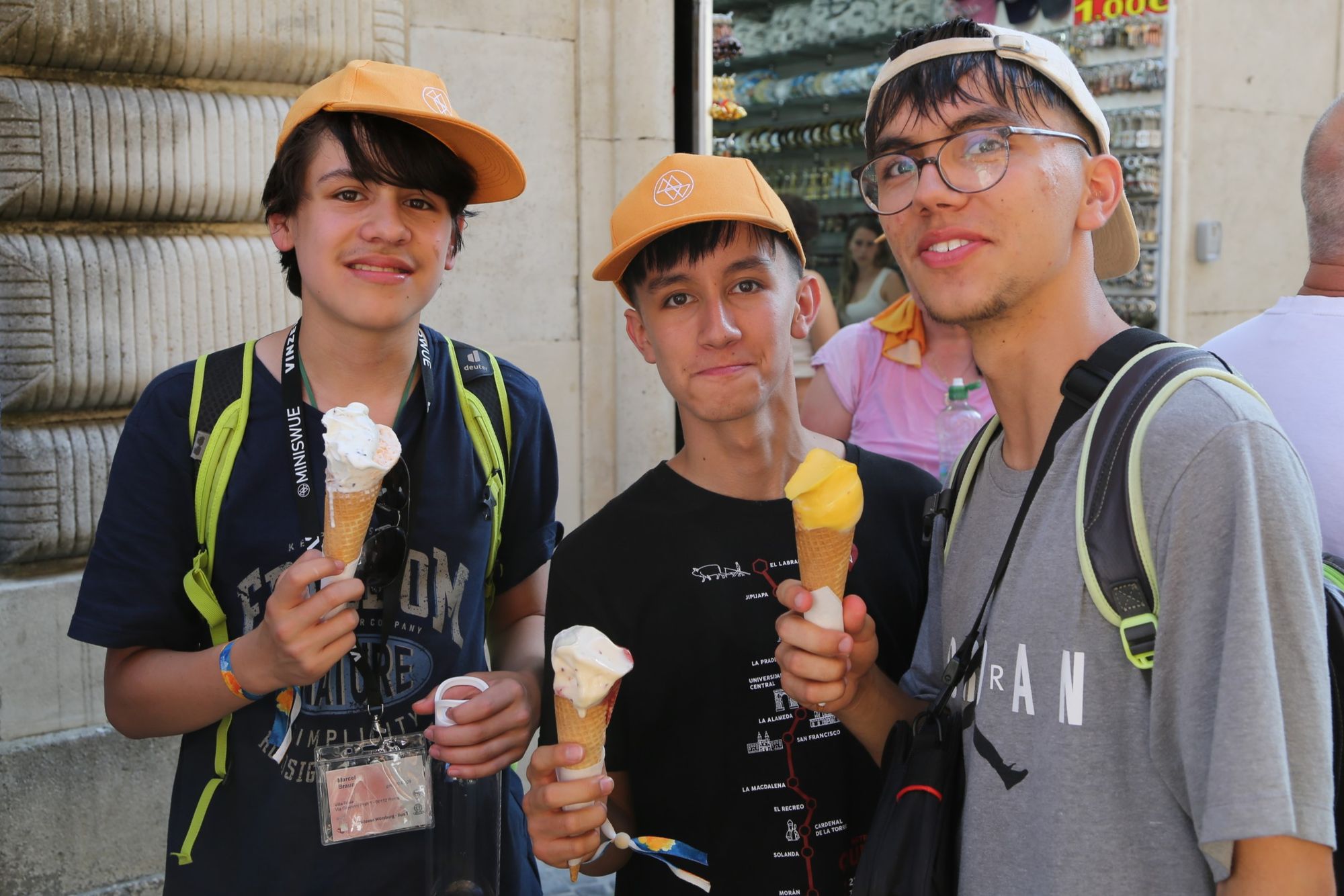 Gesagt, getan: Die Gruppe hat sich für die Gelateria „Sublime“ entschieden. Zwei Kugeln darf sich jede Ministrantin und jeder Ministrant aussuchen. Einige bestellen selbstbewusst auf Italienisch: „Cono, Fragola“, hört man. Und vor dem Laden gehen die Unterhaltungen los: „Welche Sorte hast du genommen?“ oder „Was ist das?“ David Breitenbach (18) aus der Pfarrei Sankt Peter und Paul in Aschaffenburg-Obernau erhält sogar eine besondere Info. Er habe den Bischof nach seiner Lieblingseissorte gefragt. „Zitrone und Haselnuss war es, glaube ich“, sagt er.