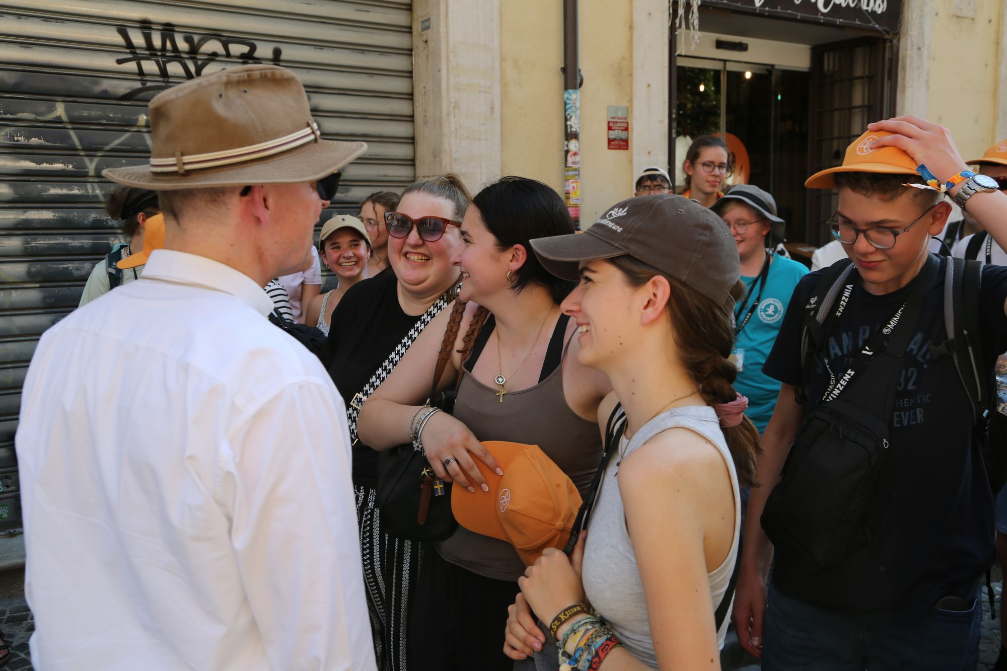 Die ganze Woche über werden Bischof Jung und Generalvikar Dr. Jürgen Vorndran verschiedene Gruppen begleiten – manche zu Sehenswürdigkeiten, manche direkt zum Eis essen. Das komme ganz darauf an, wie überlaufen die Sehenswürdigkeiten sind, sagt Bischof Jung. Auch spontan würden sie in der Stadt immer wieder auf Gruppen aus dem Bistum Würzburg treffen. Viele erkennt man direkt an ihren orangenen Kappen. „Das ist dann immer schön, das Miteinander“, sagt Bischof Jung. Er freue sich, wieder in Rom zu sein und den Ministrierenden Ecken der Stadt zu zeigen, die ihm selbst etwas bedeuten. Bischof Jung hat während seines Studiums in Rom gelebt.
