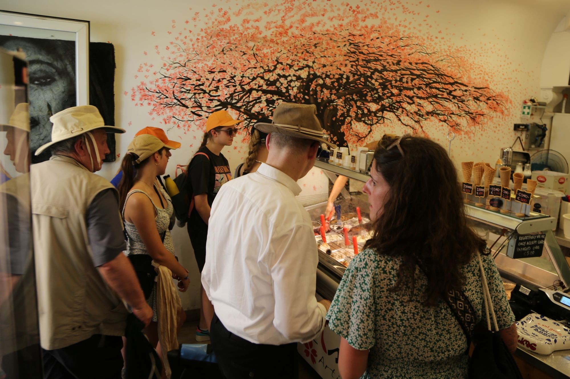 Lea Dunato (22) aus der Pfarrei Sankt Kilian erzählt, sie kannte bislang nur den Pfarrer in ihrer eigenen Gemeinde. Einen Besuch des Bischofs „erlebt man nicht jeden Tag“, sagt sie. „Und jetzt mit ihm Eis essen zu gehen, ist schon ein cooles Gefühl.“ Dunato war 2018 bereits einmal bei der Romwallfahrt als Ministrantin dabei. Die vielen Gespräche mit internationalen Ministrierenden hätten ihr gefallen. „Das ist nicht übertrieben, das war wirklich die schönste Woche in meinem Leben.“ Sie hofft, dass diese Fahrt ähnlich bereichernd wird. Auch Daniel Breitenbach (15) und Marcel Braun (15) freut der gemeinsame Eis-Ausflug. „Eine richtig coole Erfahrung“ und „eine Ehre“, sagen sie. Sie genießen die Gemeinschaft in ihrer Ministrantengruppe, die teilweise bereits seit Jahren gemeinsam unterwegs ist.
