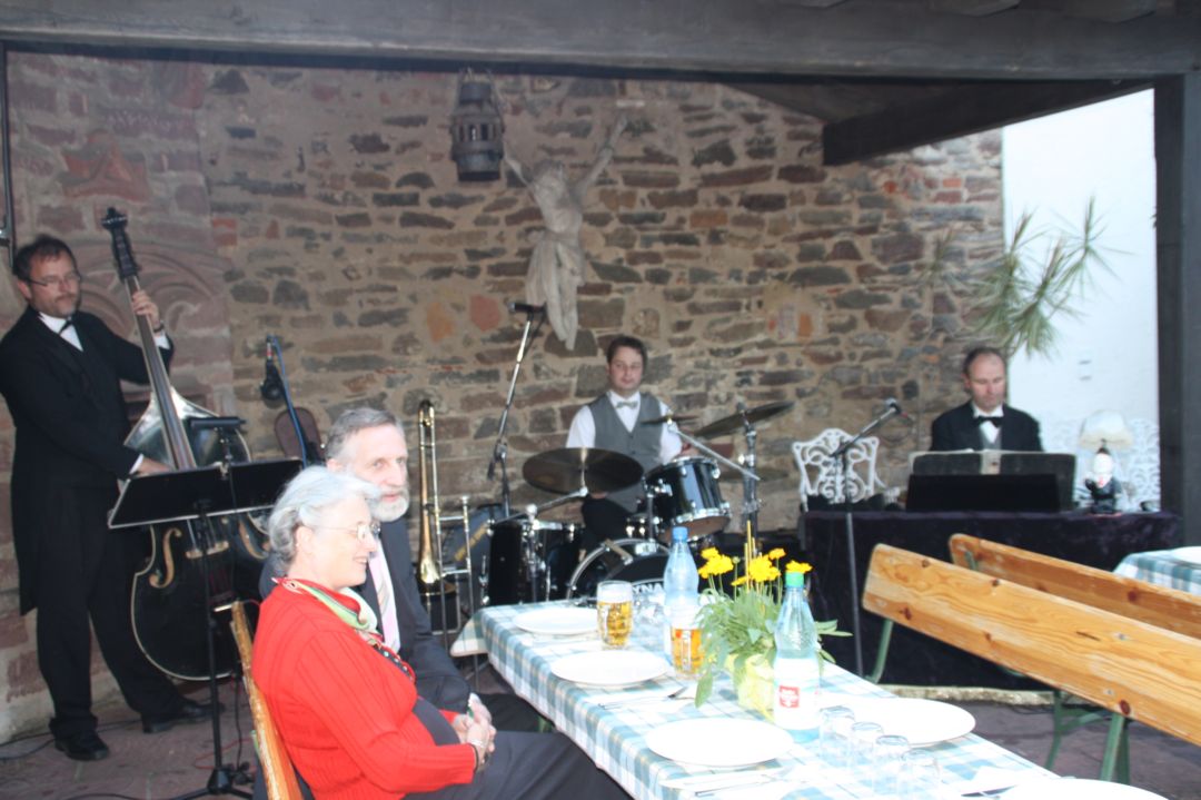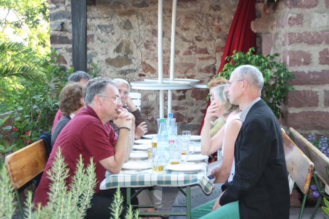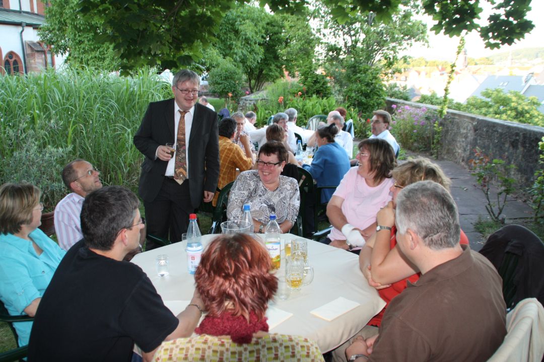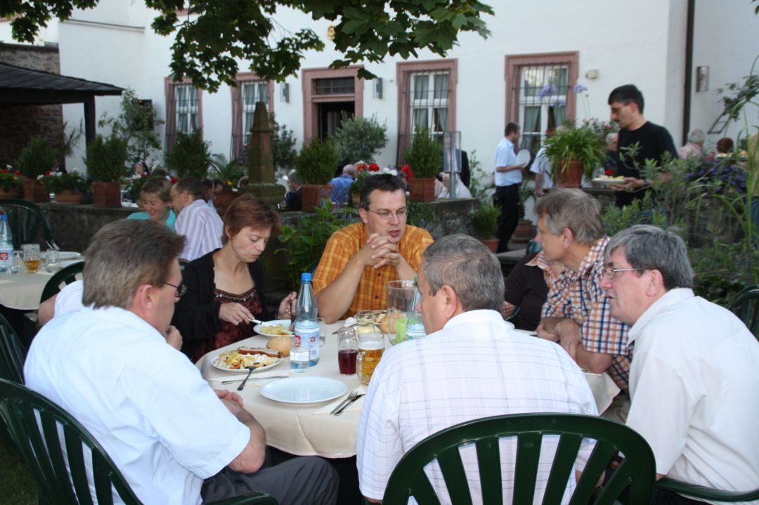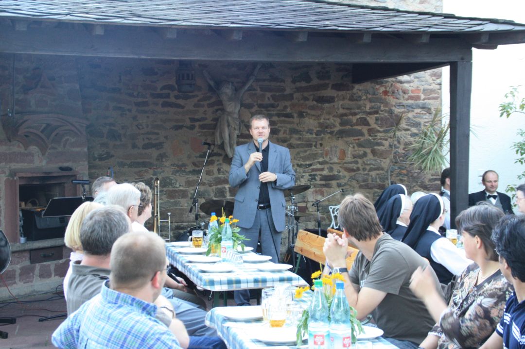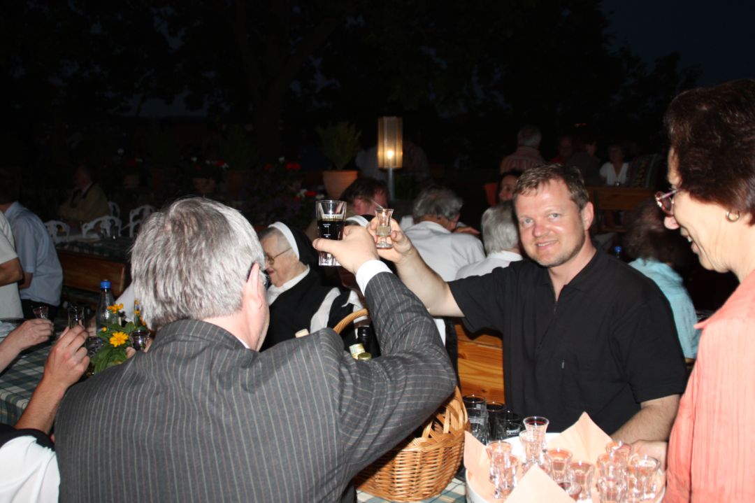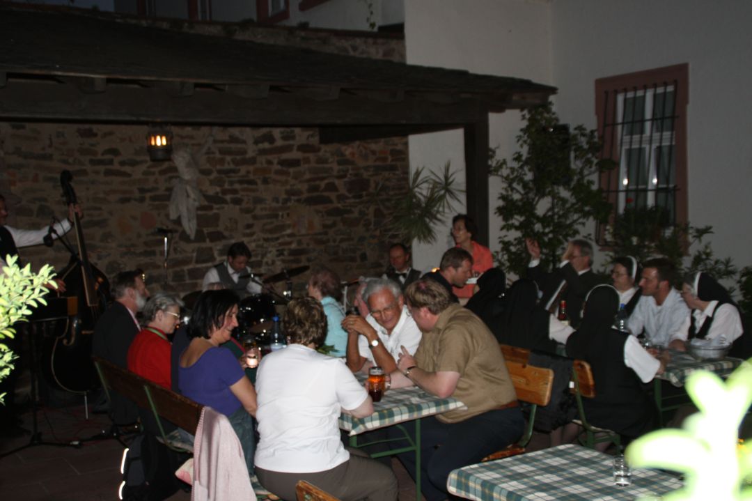 Nach der Vesper in der Stiftsbasilika, in der Dekan Vorndran den Heiligen Franziskanermönch Bonaventura in den Mittelpunkt stellte, ging es zur Begegnung in den Stiftsgarten. „Bratwurstdies“ war nur der Titel der Veranstaltung: die Gäste hatten Salate und Süßspeisen mitgebracht, dazu gab es Spanferkel, Bier vom Fass und leckere Weine. Musikalisch umrahmt wurde der Abend vom „Kleinen Saison-Orchester“ rund um den Allround-Musiker Karl-Heinz Koch. Bis in die späten Abendstunden nutzten die gut 130 Gäste das Treffen zu Gespräch und Begegnung.
