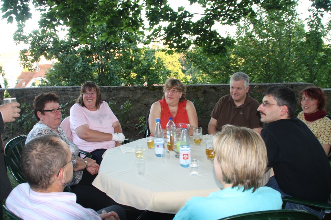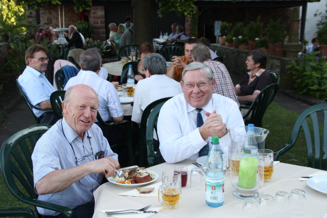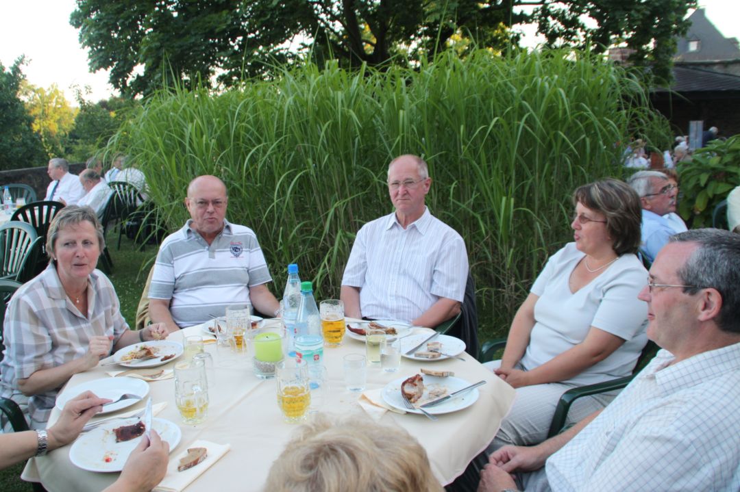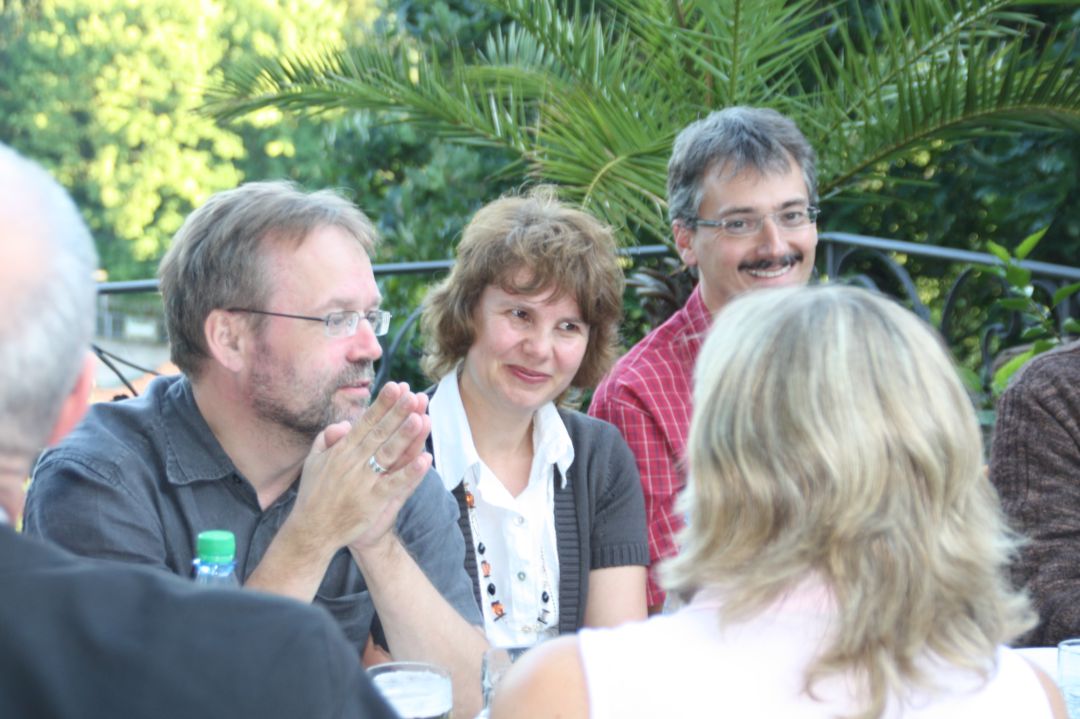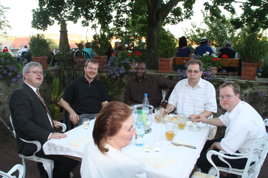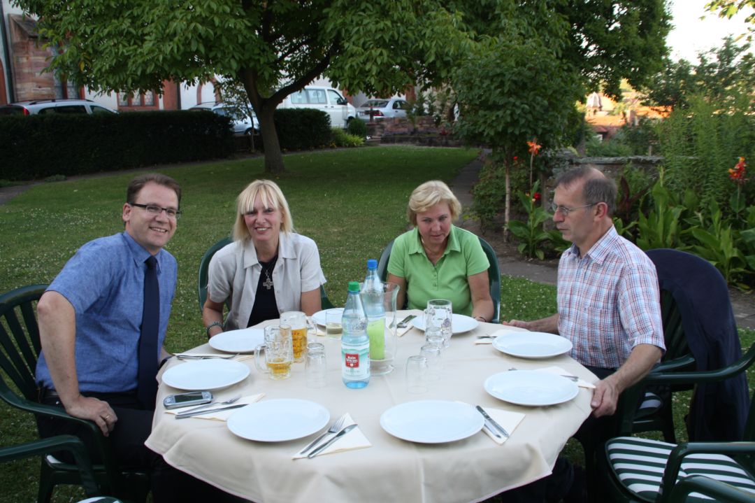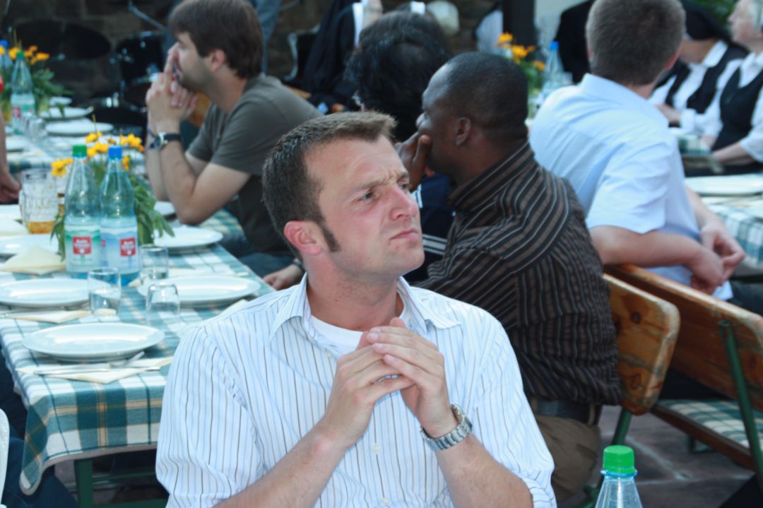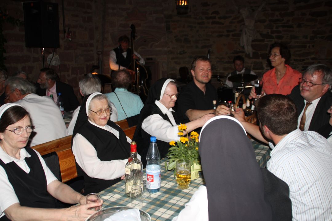 Nach der Vesper in der Stiftsbasilika, in der Dekan Vorndran den Heiligen Franziskanermönch Bonaventura in den Mittelpunkt stellte, ging es zur Begegnung in den Stiftsgarten. „Bratwurstdies“ war nur der Titel der Veranstaltung: die Gäste hatten Salate und Süßspeisen mitgebracht, dazu gab es Spanferkel, Bier vom Fass und leckere Weine. Musikalisch umrahmt wurde der Abend vom „Kleinen Saison-Orchester“ rund um den Allround-Musiker Karl-Heinz Koch. Bis in die späten Abendstunden nutzten die gut 130 Gäste das Treffen zu Gespräch und Begegnung.