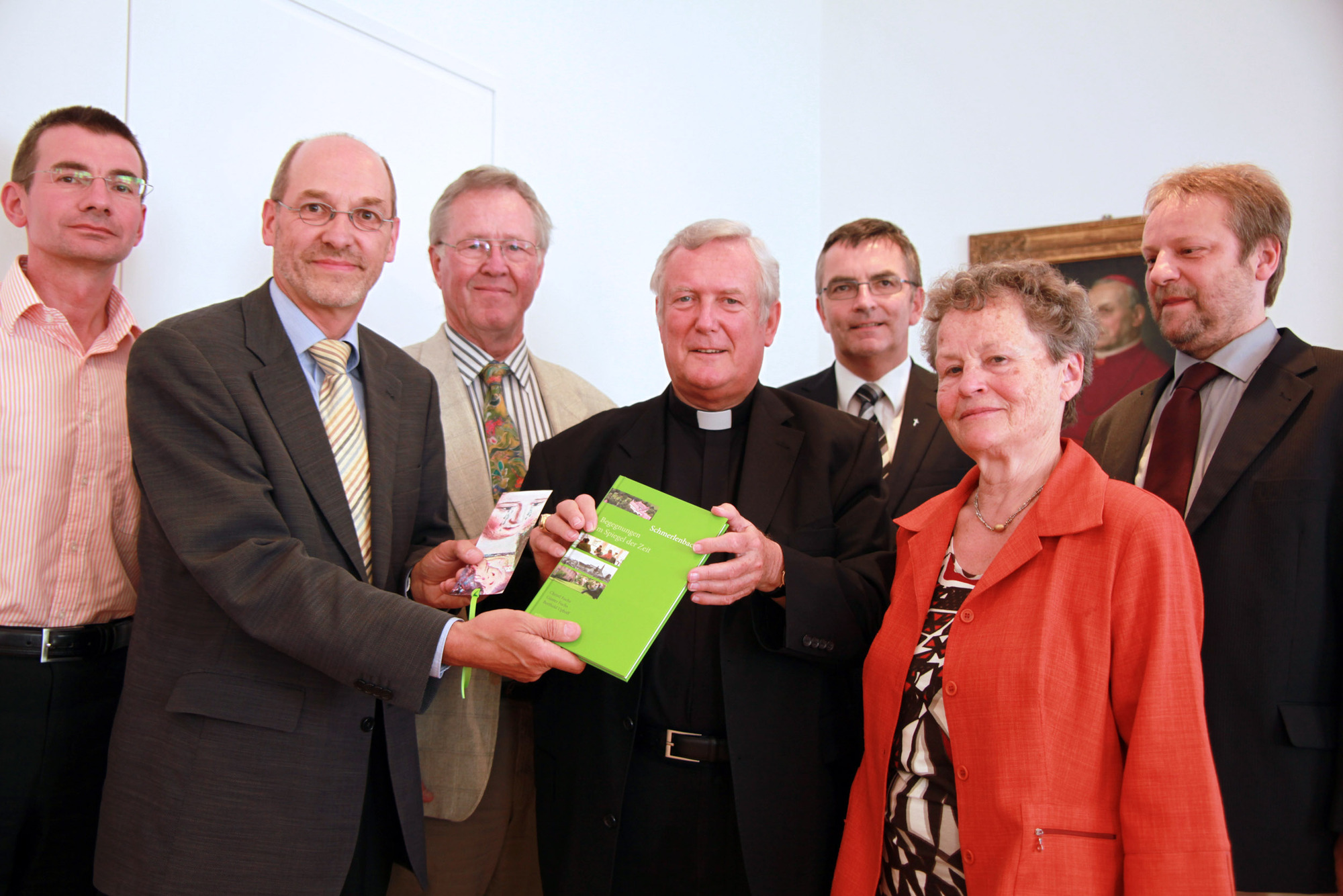 Die Autoren Christl Fuchs, Günter Fuchs und Dr. Berthold Uphoff sowie Fotograf Dr. Günter Henner überreichten zusammen mit Domkapitular Dr. Helmut Gabel und Verlagsleiter Thomas Häußner das Werk bei einer Vorstellung im Würzburger Bischofshaus an Bischof Dr. Friedhelm Hofmann. Als Zugabe für den Bischof gab es noch ein eigens angefertigtes Lesezeichen mit Motiven der Muttergottes von Schmerlenbach.