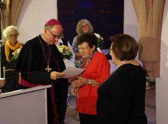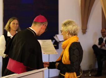 Ehrenurkunden des Sankt Michaelsbunds für die vielfältigen Verdienste um die Bücherei von Bürgstadt (Landkreis Miltenberg) überreichte der Bischof an Gertrud Karch und Johanna Hofmann. Als 1983 die ehemalige Pfarreibücherei in die gemeinsame Trägerschaft von Kommune und Pfarrei überging, war Karch, damals Mitglied des Gemeinderats und des Büchereikuratoriums, in die Umstrukturierung mit eingebunden. Sie begleitete die Einrichtung einer Kartei für die Ausleihe ebenso wie die Einführung der EDV wenige Jahre später und betreute zwei Umbauten mit. Die Zahl der Ausleihen stieg von 12.000 im Jahr 1984 auf über 65.000 im Jahr 2018. „Heute ist die Gemeindebücherei, die ausschließlich von Ehrenamtlichen organisiert wird, mit regelmäßigen Literaturkreisen, Gesprächskreisen, Schulklassenführungen und zahlreichen anderen Veranstaltungen ein Besuchermagnet“, sagte Koschel in der Laudatio. 2004 gab Karch die Leitung an Johanna Hofmann ab, die in gleicher Weise die Einrichtung weiterführe. So organisierte sie eine Begegnung beim Schachspiel und Adventsgebäck für Flüchtlinge und Bürgstädter Bürger. Zudem stehe Hofmann auch in Verhandlungen, um den Büchereiraum zu erweitern, damit sich die Bibliothek als Treffpunkt weiterentwickeln kann.