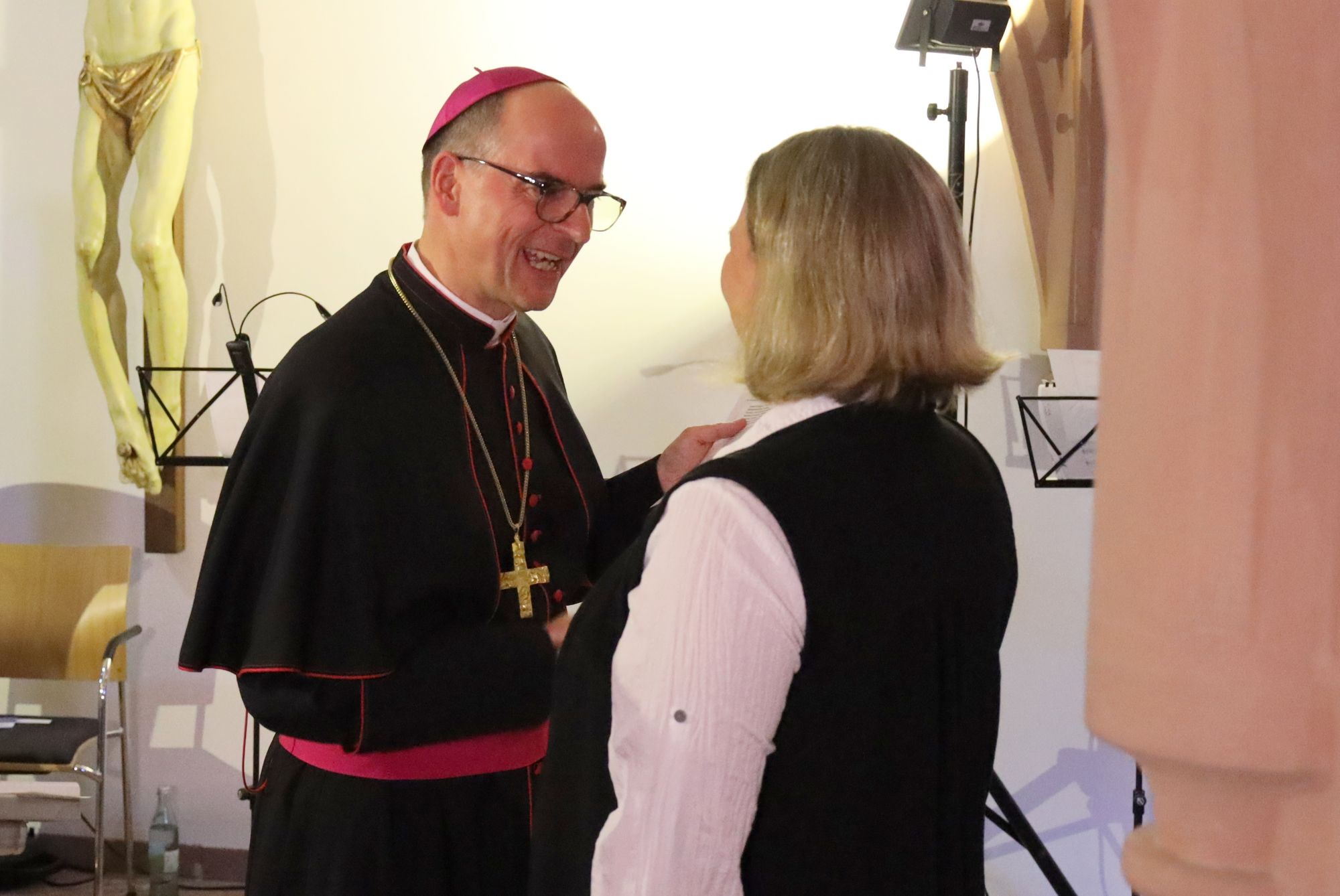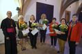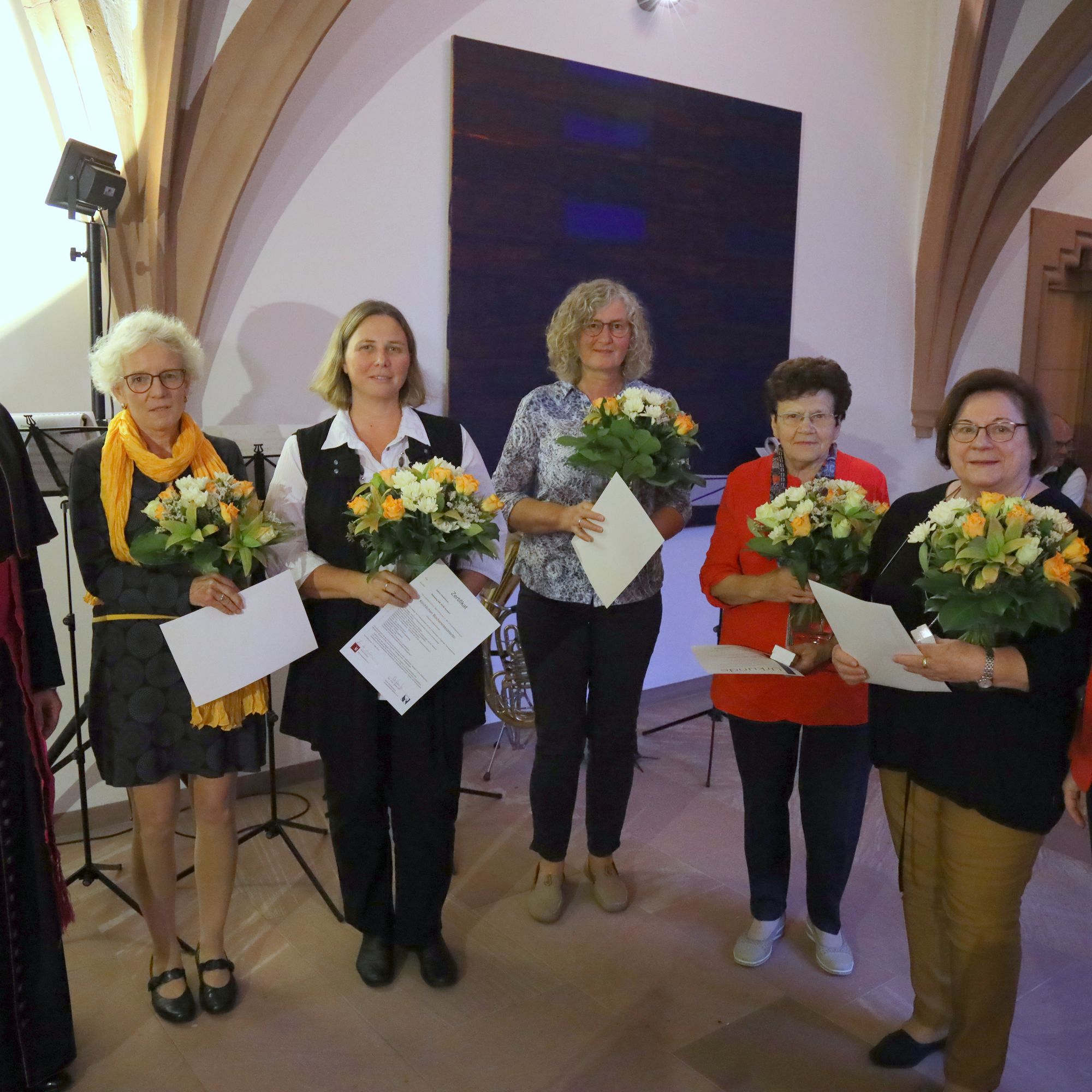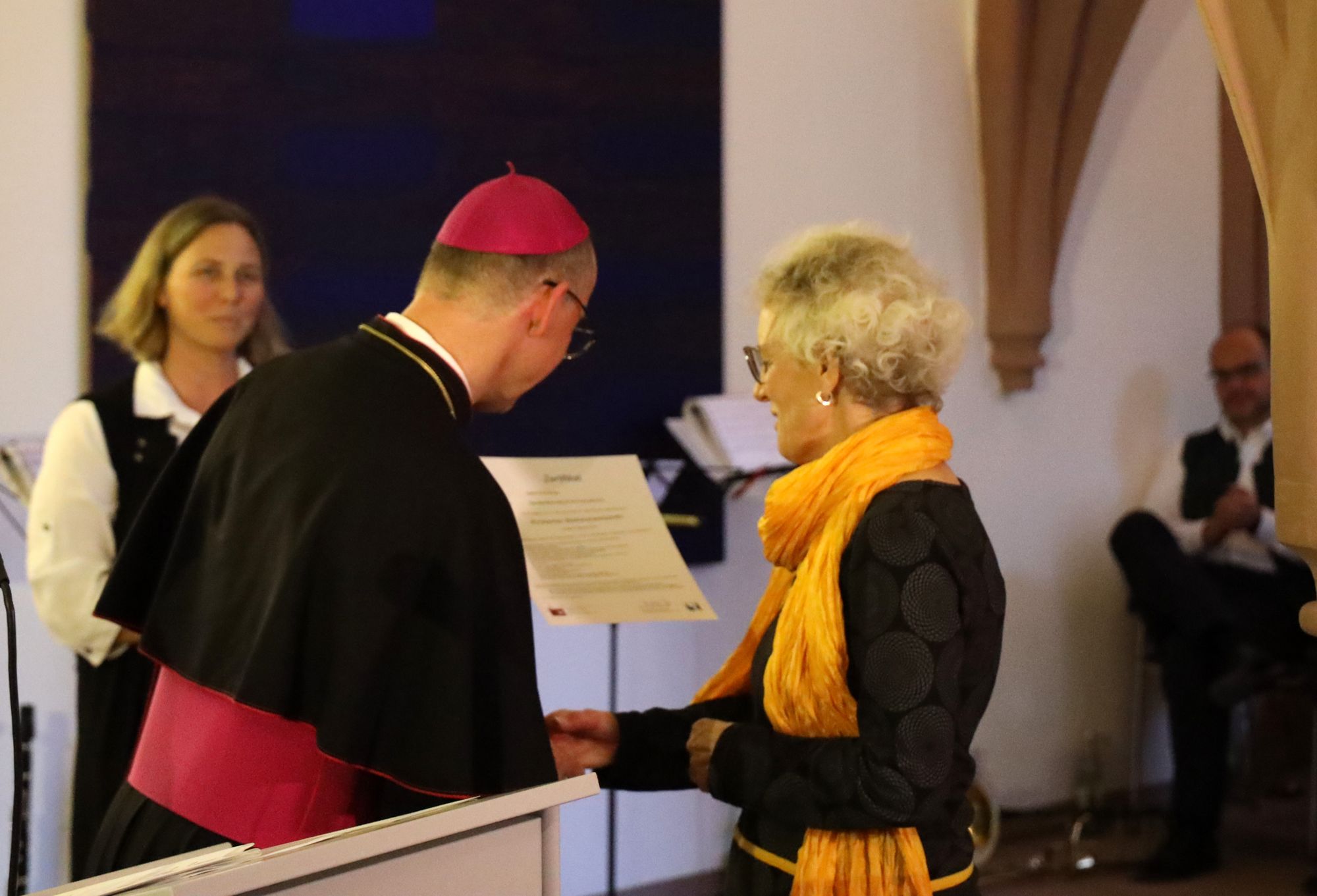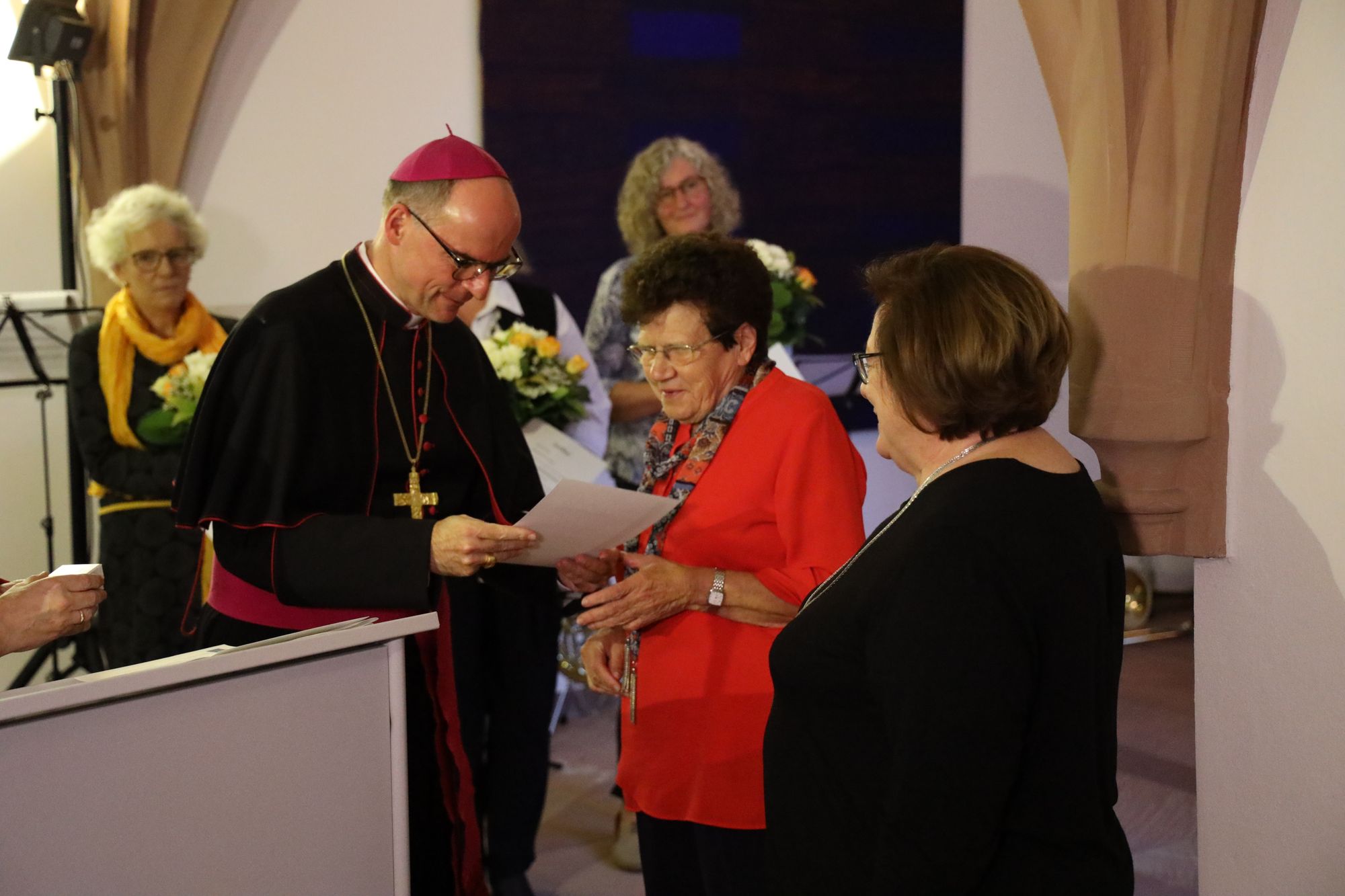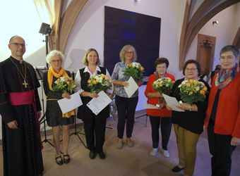 Gemeinsam mit Almut Koschel, Leiterin der Katholischen Büchereifachstelle im Medienhaus der Diözese Würzburg, überreichte Bischof Jung drei Frauen die Zertifikate über den erfolgreichen Abschluss als Kirchliche Büchereiassistentin. Außerdem ehrte er zwei Frauen aus Bürgstadt für ihr langjähriges Engagement in der dortigen Bücherei.