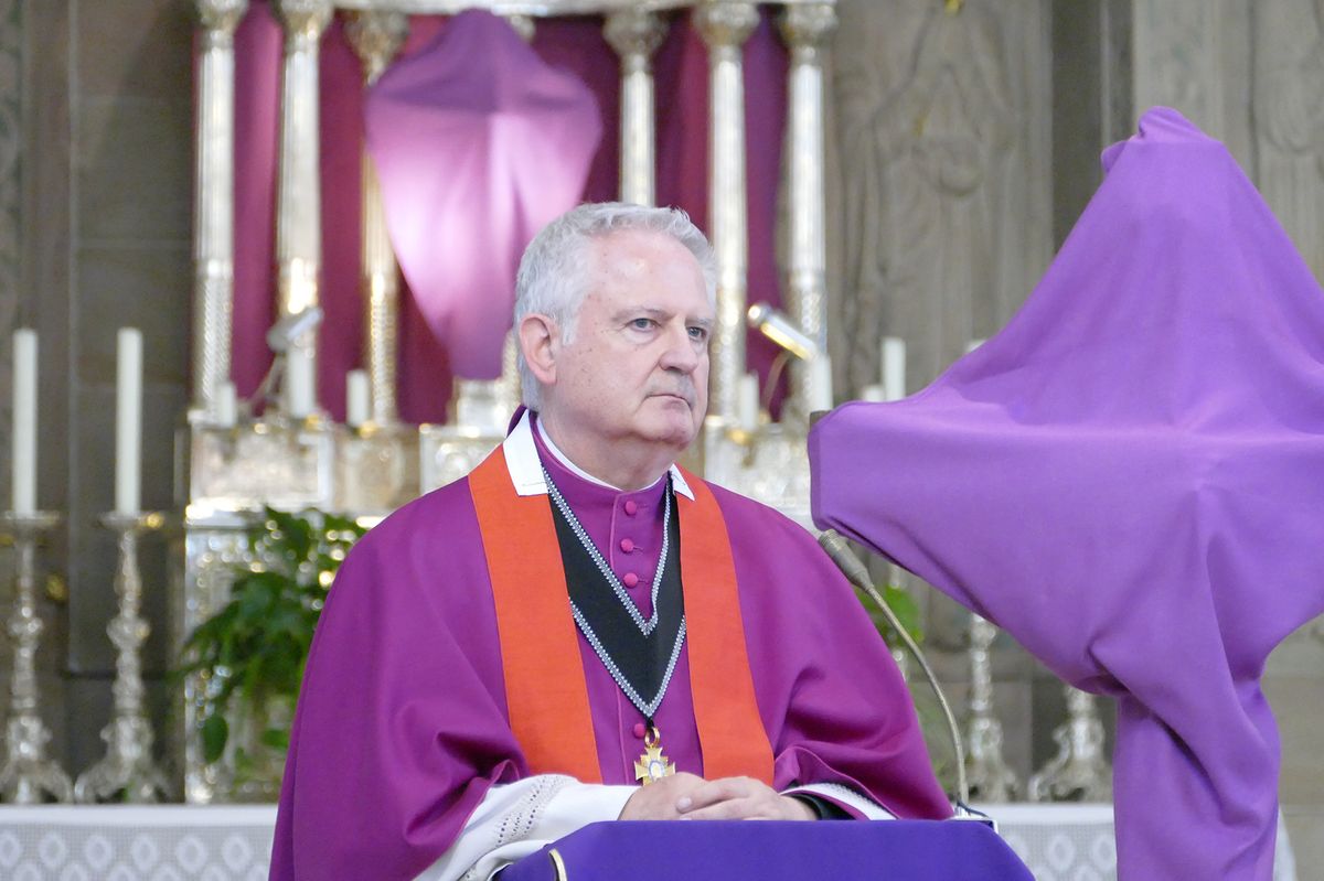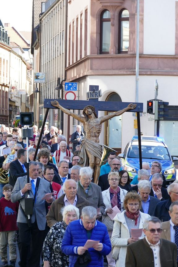 Dort stellte Domdekan Putz in seiner Predigt den gekreuzigten Jesus Christus in den Mittelpunkt. „Wir können ihn nicht hängen lassen“, lautete sein Aufruf am Ende der Prozession. Er verwies auf das große Holzkreuz, dass von den Teilnehmern mitgetragen wurde. So wie die Sodalität den Gottessohn heute mit der Prozession rituell ins Leben der Stadt geholt habe, müsse man ihn auch ins wirkliche Leben einlassen. „Und es gilt auch die andere Botschaft des Kreuzes: Gott lässt uns nicht hängen“, führte Putz weiter aus.