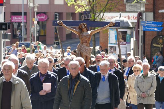 Aschaffenburg (POW) Rund 180 Teilnehmer haben am Sonntag, 7. April, bei sonnigem Frühlingswetter die Kreuzprozession der Eucharistisch-Marianischen Männersodalität durch Aschaffenburg begleitet. Immer am fünften Fastensonntag tragen die Sodalen ein großes Holzkreuz von der Sandkirche aus durch die Innenstadt und beten dabei die Stationen des Kreuzweges. Begleitet wurden Sie in diesem Jahr von Domdekan Prälat Günter Putz, Schulreferent des Bistums Würzburg, ihrem Präses Pfarrer Robert Stolzenberger und dem Aschaffenburger Dekan Wolfgang Kempf. Wegen des Frühlingsmarktes führte die Strecke dieses Jahr nicht über den Marktplatz, sondern durch die Treibgasse zur Kapuzinerkirche.