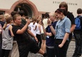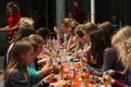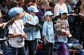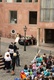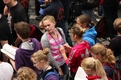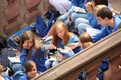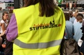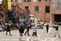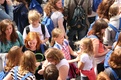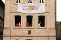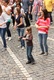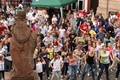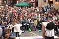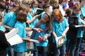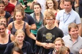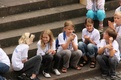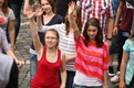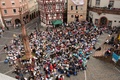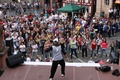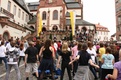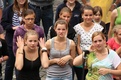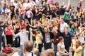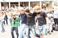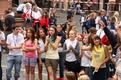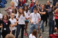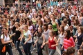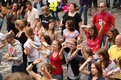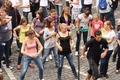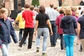 Nicht nur das Brautpaar wurde an diesem Tag von den Sängerinnen und Sängern überrascht. Als die Jugendlichen nach dem Friedensgebet in kleinen Gruppen in der Stadt ausschwärmten, blieben sie weiterhin hörbar. Ein leicht irritiertes „Da singen ja welche!“ war immer wieder von Passanten in der Fußgängerzone zu hören, wenn sie auf Gruppen von Jugendlichen trafen, die einfach mal so ein Liedchen anstimmten. Genau das machte diesen Freitag in der Aschaffenburger Innenstadt zu etwas Besonderen, die gute Stimmung der jungen Leute übertrug sich auf alle, die in ihre Nähe kamen. „Man kann hier spüren, dass Kirche jung und lebendig sein kann“, sagte ein sichtbar begeisterter Andreas Unterguggenberger, Stiftskantor und Vorsitzender des Pueri Cantores Diözesanverbandes Würzburg, zu diesem Phänomen. Er hatte mit 50 Helfern das Programm des Tages organisiert. Und das hatte noch einiges zu bieten. Zunächst wurden im Martinushaus nach und nach alle Teilnehmer verköstigt. In verschiedenen Gruppen konnten sie dann zum Beispiel an Stadtführungen teilnehmen. Auf dem Stiftsplatz gaben drei Chöre Kurzkonzerte, diesmal auch mit weltlichem Liedgut. Da war unter anderem „Jetzt ist Sommer“ von den Wise Guys, „Dancing Queen“ von Abba oder „Ein Kompliment“ von den Sportfreunden Stiller zu hören. Schon bei diesen Konzerten wurde kräftig zur Musik mitgewippt und mitgeklatscht. Doch es kam noch besser: mit Personaltrainer Stefan Grossmann ließen sich gut 250 Teilnehmer zum Tanzen animieren. Bei kräftigen HipHop- und Discobeats wurden die Arme und Beine geschwungen. Das sah nicht nur gut aus, es machte Spaß und war auch noch gesund.