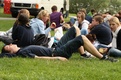 Auch auf den Main-Wiesen floss der Schweiß. Dort war ein Menschen - Kirckerturnier angesagt. 31 Mannschaften hatten sich gemeldet. Sie trafen in 29 Spielen zu jeweils sechs Minuten aufeinander. Am Ende stand der Jugendchor St. Oswald aus Buchen auf dem Siegertreppchen, dicht gefolgt vom Jugendkathedralchor aus Fulda. Manche nutzen das schöne Wetter auch, um einfach ein wenig auf der Wiese auszuspannen und die Schiffe auf dem Main zu beobachten.