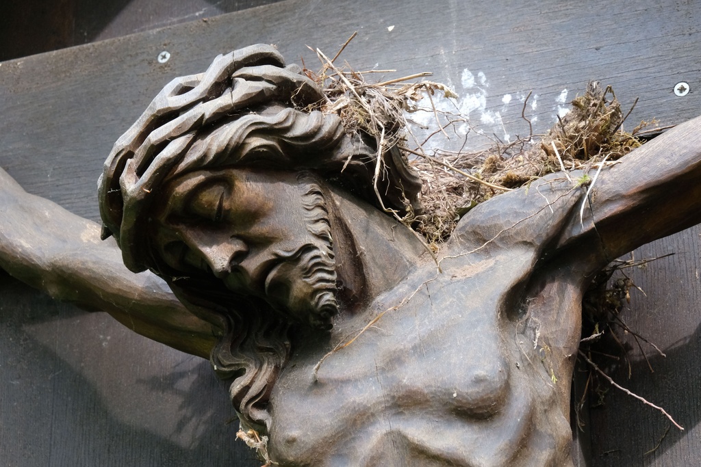 September 2023: Meine Frau und ich genießen einen Spaziergang auf dem Gelände der Gemündener Kreuzschwestern. Am Waldrand treffen wir auf ein hölzernes Kruzifix. Wir betrachten es näher: Jesu Haupt ist gebeugt. Die Augen sind geschlossen. Das Leiden ist vorbei. Das Gesicht strahlt Ruhe und Frieden aus. Noch etwas bannt unseren Blick: Auf den Schultern Jesu hatten Vogeleltern ein Nest gebaut. Jetzt ist es verlassen. Die Jungen sind flügge geworden und haben die neue Freiheit erobert.