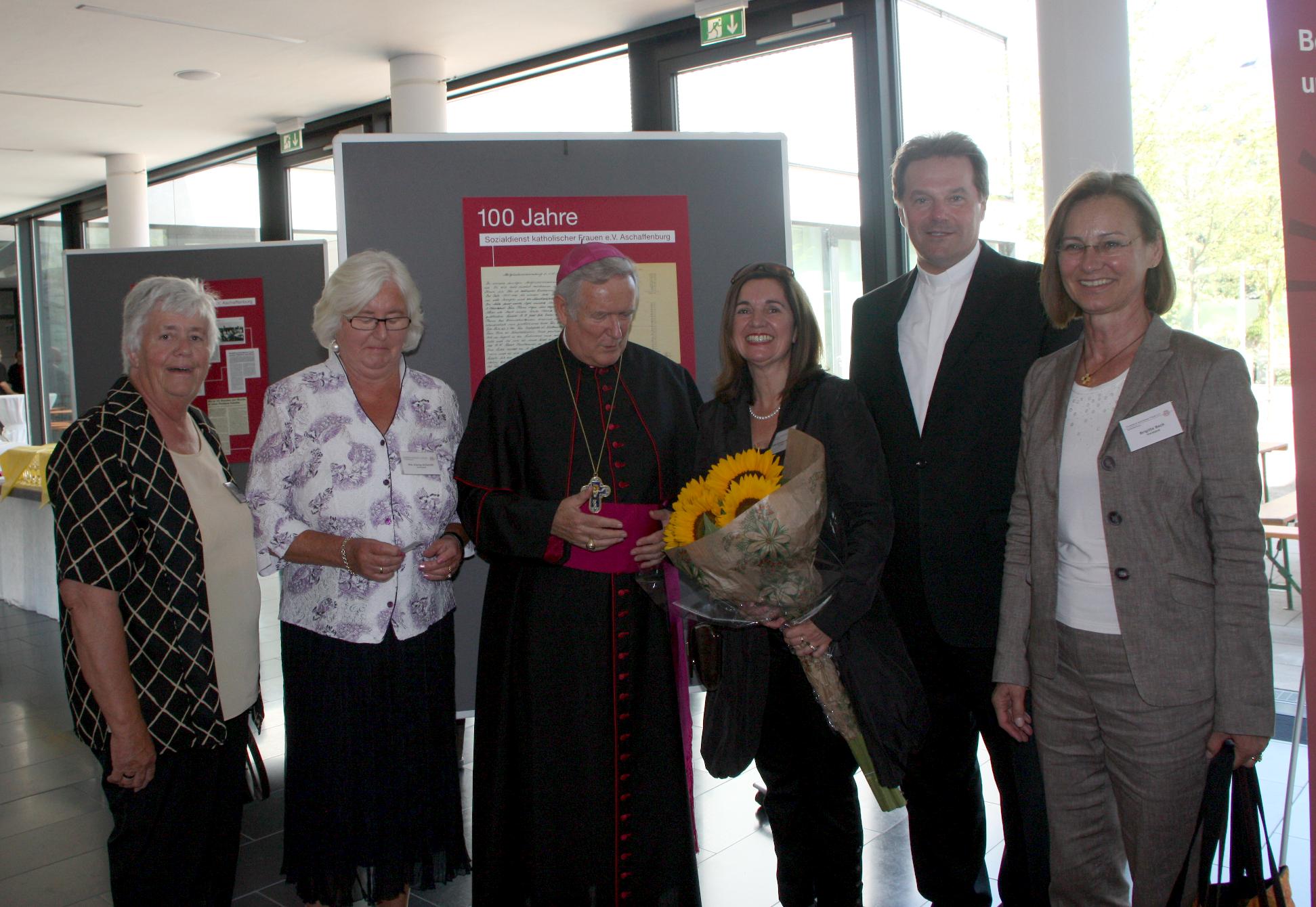Die Jubiläumsfeier begann für die haupt- und ehrenamtlichen Mitarbeiter des Aschaffenburger Vereins und deren Gäste mit einem Gottesdienst, den Bischof Friedhelm Hofmann in der Stiftsbasilika zelebrierte. Der Oberhirte bedankte sich in seiner Predigt für das Engagement der Frauen über diese lange Zeit. Man hätte all die Jahre nicht vergessen, „dass es nicht nur darauf ankommt, dass etwas geschieht, sondern wie etwas geschieht“, so Hofmann. In der christlichen Nächstenliebe spiegele sich die Liebe Christi zu den Nächsten, betonte der Bischof und unterstrich, wie wichtig dabei das Zusammenspiel von ehren- und hauptamtlicher Arbeit ist. Eindringlich forderte er, dass alle Bemühungen des Vereins letztlich darauf ausgerichtet sein müssen, dem konkreten Menschen in Not effektiv zu helfen. Jesus hätte deutlich gemacht, das es uns dabei nicht um eine bloße Befolgung von Regeln und Gesetzen gehen darf, so der Prediger. „Wir müssen immer den Menschen im Blick haben und dessen individuelle Situation erkennen und darauf eingehen“. Dem Gottesdienst wohnten auch Domkapitular Clemens Bieber, Leiter der Hauptabteilung soziale und caritative Dienste im Ordinariat Würzburg und der Aschaffenburger Dekan Stefan B. Eirich bei. Stiftspfarrer Martin Heim, der zu Beginn des Gottesdienstes die Gäste begrüßte, ist zugleich auch geistlicher Beirat des Vereins.