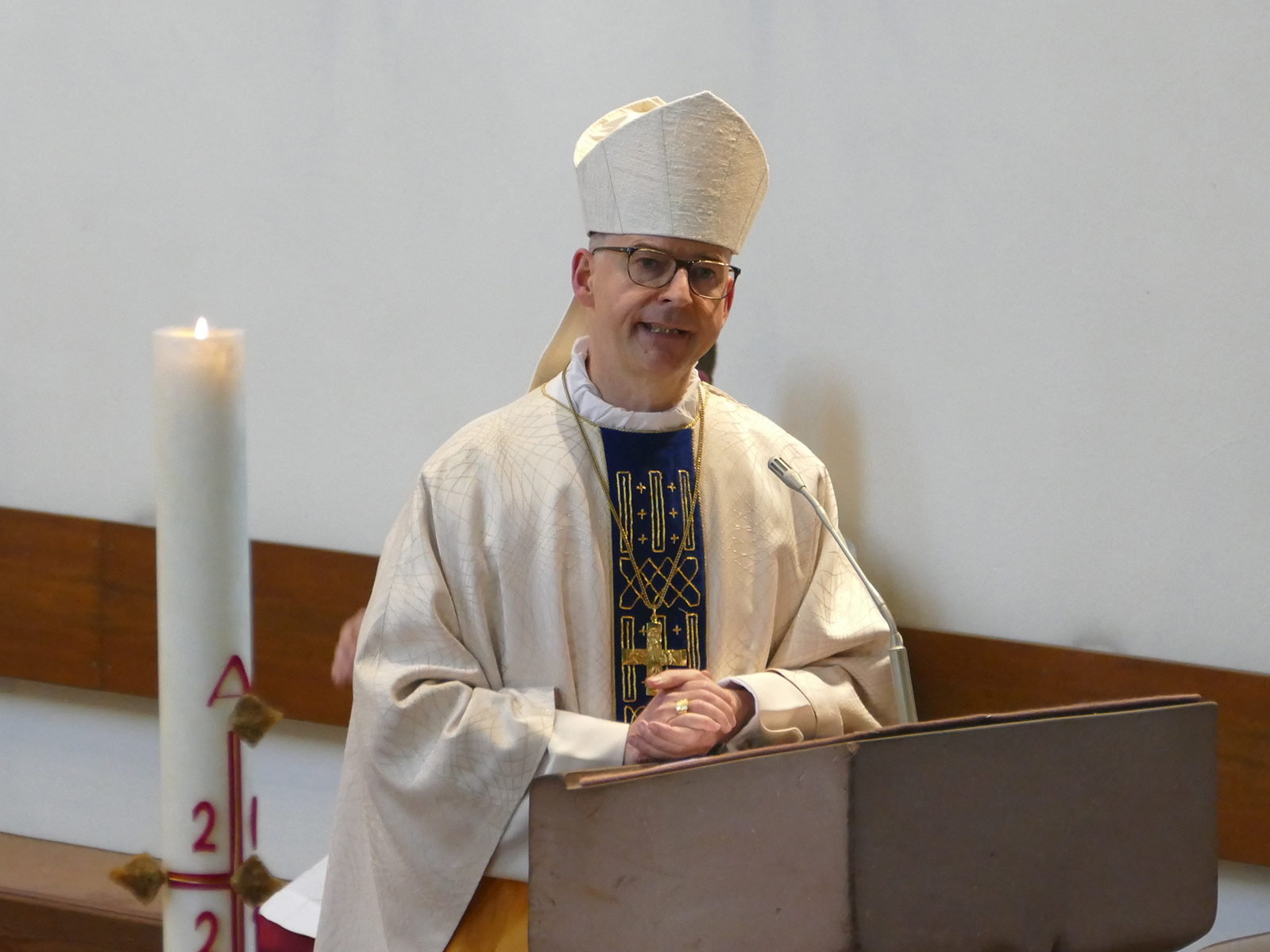 In seiner Predigt würdigte der Bischof diesen Zusammenschluss von Laien als wichtigen Beitrag für das Leben der Kirche. Bruderschaften und Sodalitäten seien immer aus wacher Zeitgenossenschaft heraus entstanden und eine Antwort auf eine konkrete Not in der Gesellschaft gewesen. Bischof Jung übertrug das auf die aktuelle Situation in Aschaffenburg, wo die Kirchengemeinden gerade zu einem gemeinsamen Pastoralen Raum umstrukturiert werden. „Als pfarreiübergreifender Zusammenschluss kann die Sodalität hier gute Dienste leisten und sich mit ihrer geprägten Spiritualität aktiv einbringen“, sagte der Bischof. Er ging auch auf die sechs geistlichen Übungen ein, zu denen sich jedes Mitglied der Männersodalität verpflichtet. Sie reichen vom Besuch der Sodalenmesse über die Wallfahrt nach Walldürn bis zur Treue im Gebet. „Der Glaube nimmt von uns die Traurigkeit dieser Zeit“, zitierte Bischof Jung aus der Lauretanischen Litanei und wünschte den Sodalen, dass die Helligkeit der Sehnsucht nach Gott in den Herzen der Mitglieder und aller Aschaffenburger Einzug halte und damit alle Traurigkeit vertreibe.
