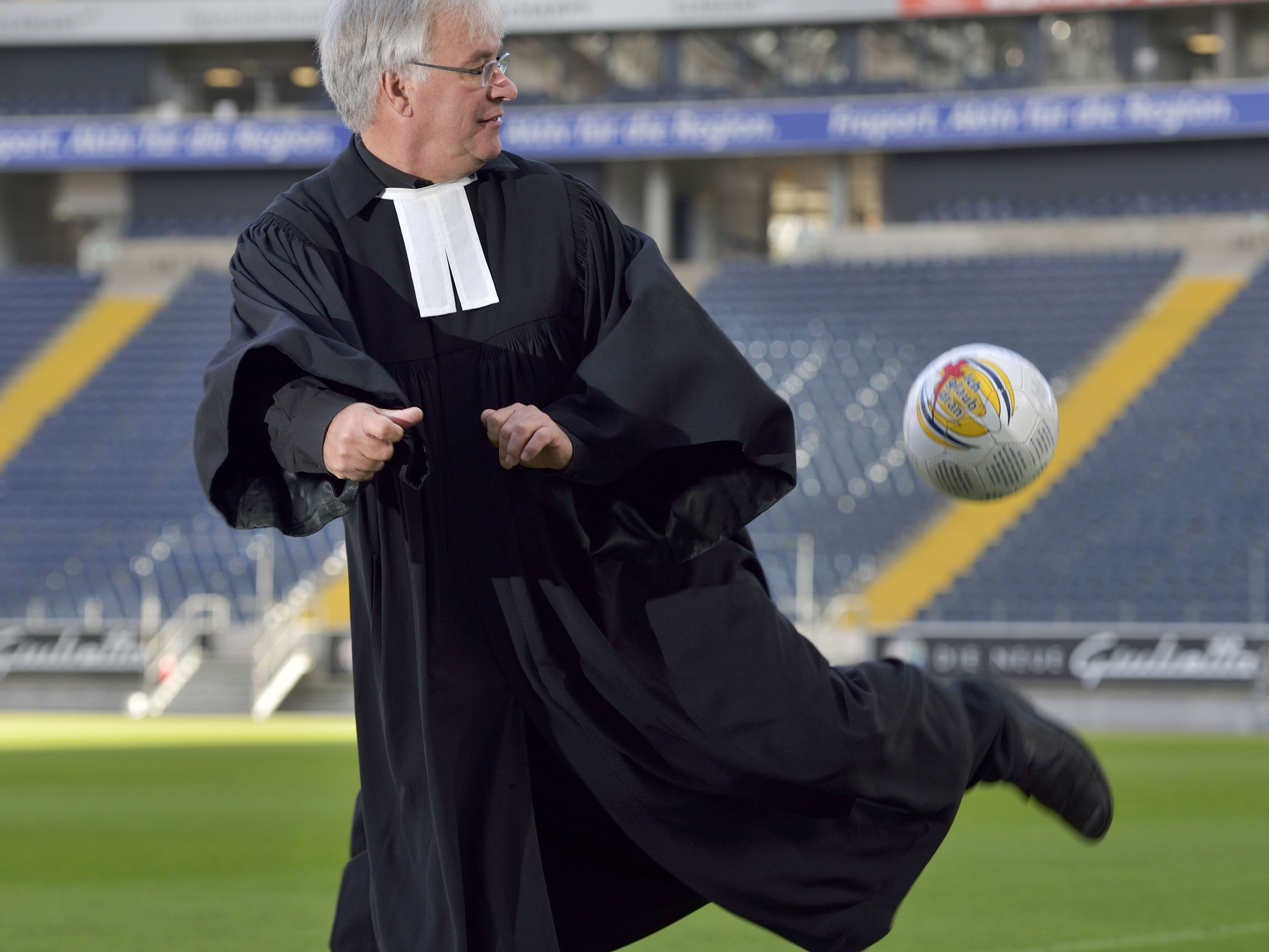 Hätten sie zum Beispiel gewusst, dass es in Deutschland in einigen großen Stadien eine Kapelle gibt? Im Frankfurter Waldstadion ist das zum Beispiel so und da arbeitet ein evangelischer Pfarrer, den man vielleicht aus einem ganz anderen Bereich kennt. Eugen Eckert ist nämlich Autor vieler Kirchenlieder – doch mit einer halben Stelle eben auch für Fußball zuständig. Am 22. Juni war zu einem Vortrag im großen Saal des Martinushauses. Burkard Vogt hat mit ihm darüber gesprochen, was er denn im Stadion so macht und wollte mehr über seine meinung vom Verhältnis von Fußball und Religion wissen.