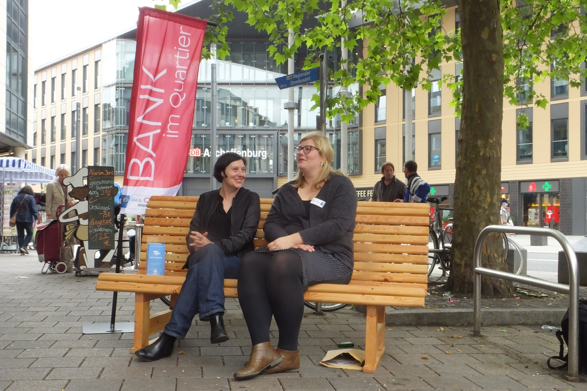 Es geht darum, mit den Menschen ins Gespräch zu kommen, die hier durch das Viertel schlendern. Deswegen ist auf der Bank immer auch schon ein Platz von einer Sozialarbeiterin besetzt. Burkard Vogt hat sich zu ihr auf die Bank gesetzt und gefragt, was sie denn da immer macht, nachdem sie Platz genommen hat.
