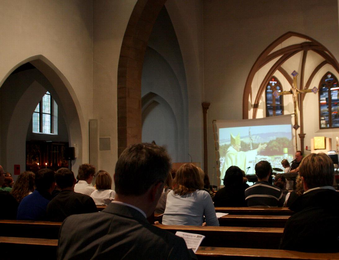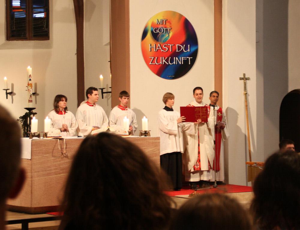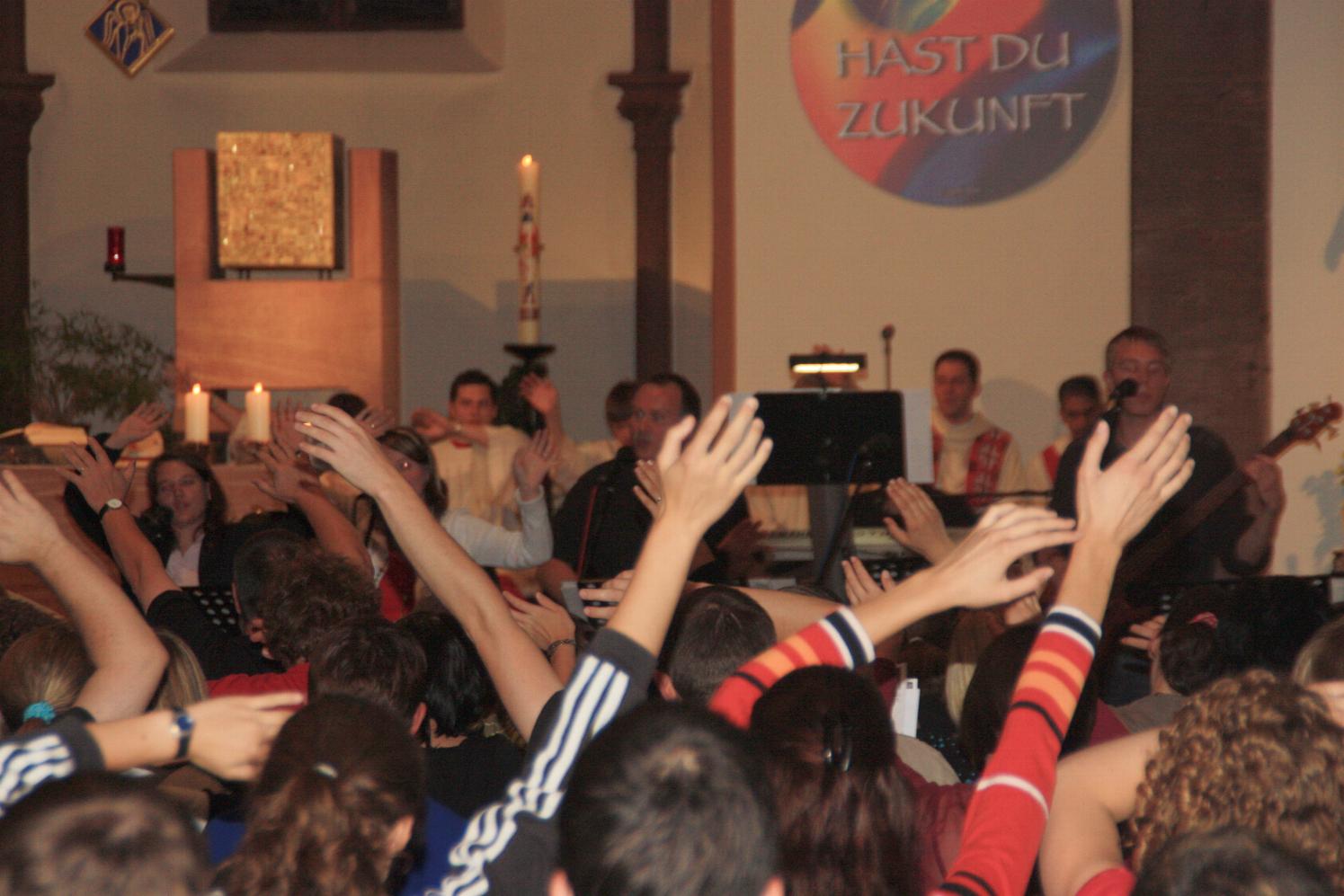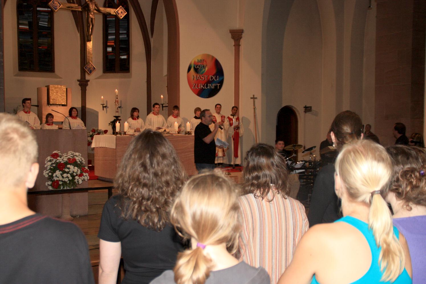 Die Zelebranten Kaplan Stefan Michelberger und Pater Joy Palachuvattil und der Regionaljugendseelsorger Richard Rosenberger luden ein, sich über die eigenen Kraftquellen auszutauschen. „Ich finde es toll, dass Gott mir immer und überall Halt gibt“ und „Die Begegnung mit den Menschen hier gibt mir Kraft für mein Leben“ waren Aussagen der Teilnehmer im Verlauf des Gottesdienstes. Und auch wenn Australien mit den Tausenden von Weltjugendtagsteilnehmern aus der ganzen Welt weit weg war, ein Hauch von Internationalität kam doch auf, als das Vater Unser gleichzeitig in fünf verschiedenen Sprachen gebetet wurde.