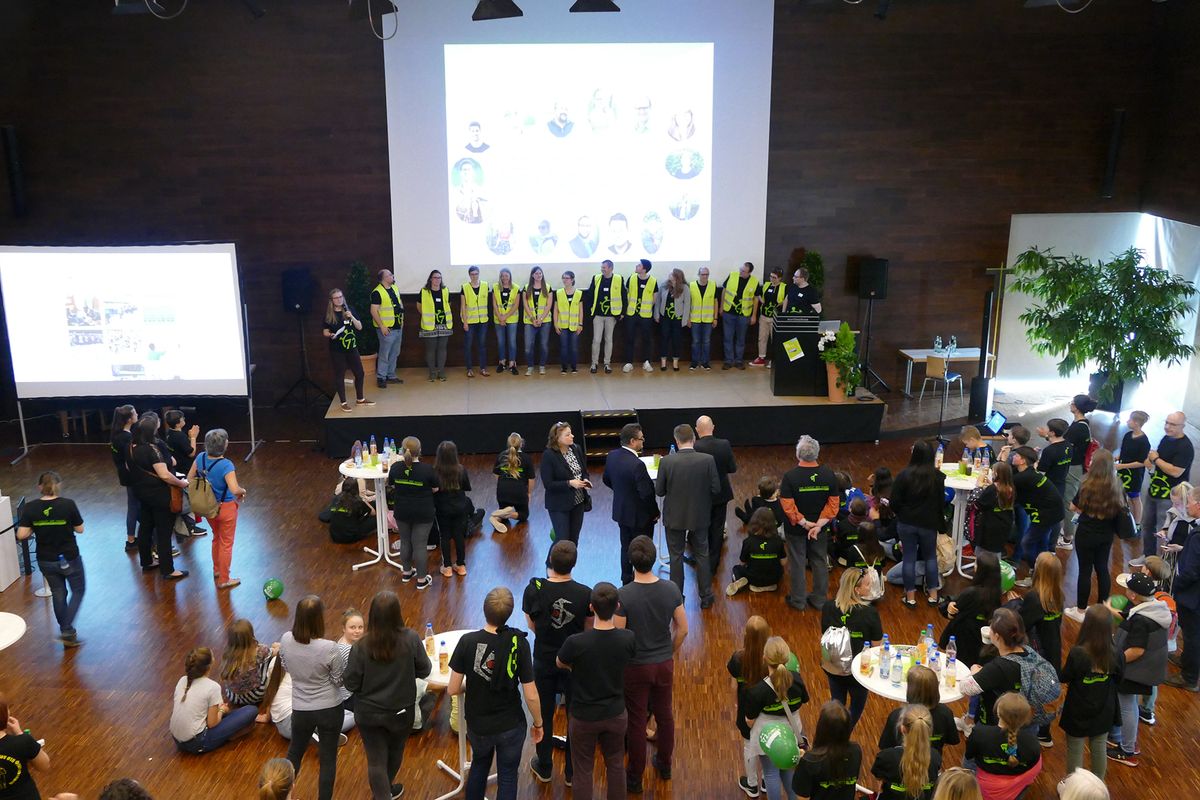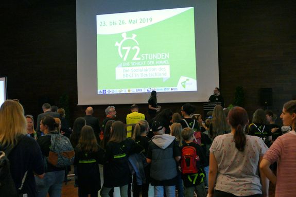 Aschaffenburg (POW) „Wir sind stark und machen die Welt ein bisschen besser!“ Knapp 300 Kinder und Jugendliche haben, angestachelt von Oberbürgermeister Klaus Herzog, diesen Ruf am Donnerstag, 23. Mai, durch das Aschaffenburger Martinushaus schallen lassen. Sie waren zusammengekommen, um gemeinsam die 72-Stunden-Aktion zu eröffnen. Der Bund der Deutschen Katholischen Jugend (BDKJ) und seine Diözesan- und Jugendverbände haben deutschlandweit zu dieser Sozialaktion aufgerufen. Während in Würzburg die bundesweite Eröffnung der Aktion gefeiert wurde, waren die Teilnehmer der Region Aschaffenburg-Alzenau im Martinushaus zusammengekommen.