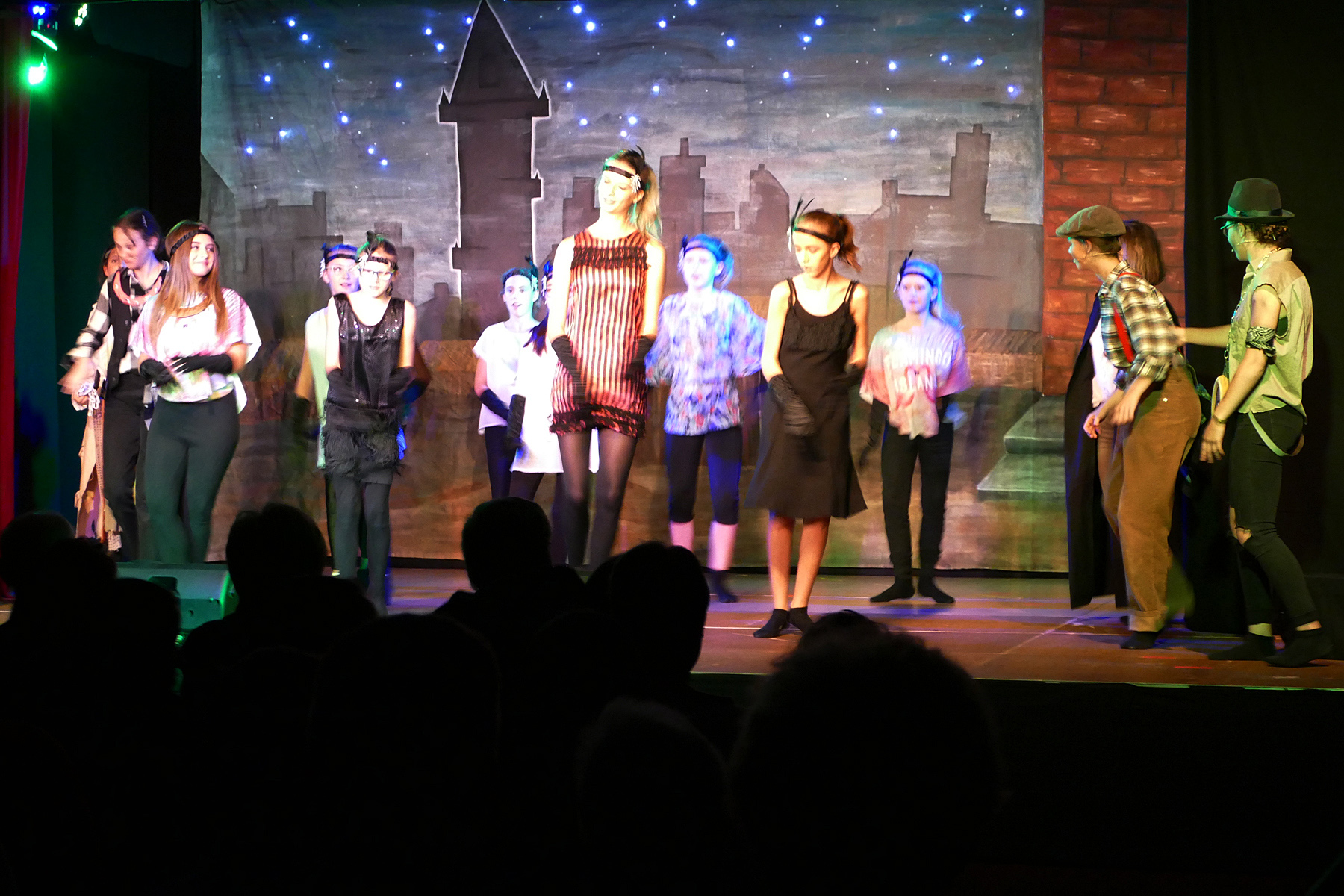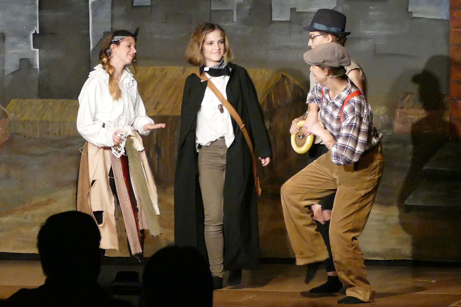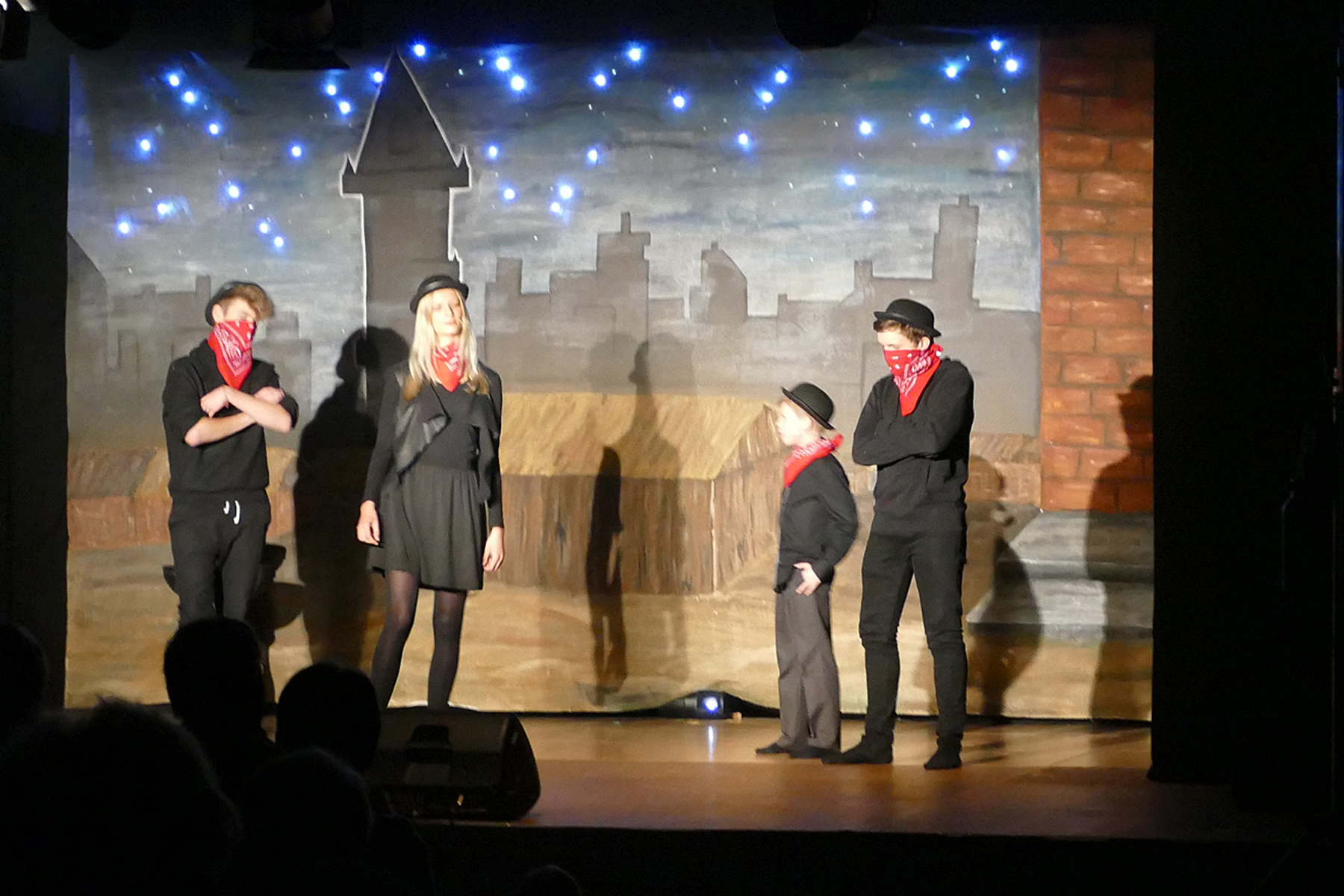 Die Haupthandlung basiert auf dem Jugendbuch „Maggie und die Stadt der Diebe“ des Freiburger Autors Patrick Hertweck. Das Waisenkind Maggie muss sich bei der Diebesbande „40 Little Thieves“ verstecken, weil es verfolgt wird – und nicht weiß, warum. So wird sie selbst zur Diebin. Nach und nach wird das Geheimnis ihrer Abstammung gelüftet und am Ende gibt es sogar ein Happy End. Eingebettet in die Handlung wurden vier selbst erfundene Geschichten, die dafür sorgten, dass die große Zahl der Mitwirkenden sich gebührend einbringen konnte. Die Untertanen zettelten eine Revolution gegen die Königin „Chantal die Größte“ an, eine Rockergruppe stürmte den Wiener Opernball, die Diebestochter Lee Long bewies sich als Kung-Fu-Meisterin. Und es galt, einen Banküberfall zu verhindern. Mit sprühender Fantasie und Spaß am Spielen meisterten die Jugendlichen das knapp zwei Stunden lange Stück und brachten das Publikum immer wieder zum Lachen und zum Mitklatschen. Szenenapplaus gab es beispielsweise nach einem fast perfekt getanzten Wiener Walzer oder für die überlange To-do-Liste von Königin Chantal.