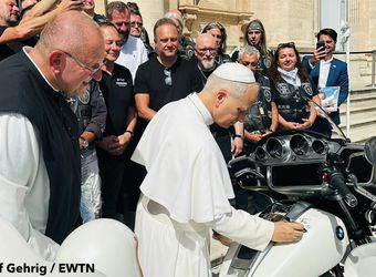 Auf dem Petersplatz glänzt die Maschine in der Sonne, als Papst Leo zunächst auf ihr unterschreibt und sich unter dem Jubel der „Jesus-Biker“ sogar kurz daraufsetzt. „Super, der Papst hat mir die Hand geschüttelt, er hat unser Motorrad unterzeichnet, er hat sich sogar draufgesetzt. Also richtig gelungen das Ganze“, freut sich Claus Dempewolf nach der Audienz.