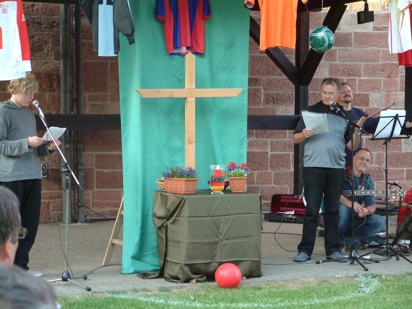Im Rahmen eines Projektes des Liturgieausschusses der Pfarrei, bei dem im Laufe des Jahres besondere Gottesdienste an besonderen Orten gefeiert werden, hatte sich die Europameisterschaft geradezu angeboten. Schließlich könne man laut Pfarrer Wolfgang Kempf, viele parallelen zwischen Glaube, Kirche und Fußball entdecken: „Es gibt Spieler, die sich einsetzen bis zum Äußersten, es gibt die Fans die unterstützen und Zuschauer, die gelangweilt dabei stehen und Menschen, die das überhaupt nicht interessiert.“ Bei den Mitspielern könne man die Verteidiger erkennen, die eher das Ergebnis bewahren wollen und Stürmer, die nach vorne Preschen um das Spiel voran zu bringen, so der Seelsorger, der seit Juni 2005 die Pfarrei St. Kilian leitet.