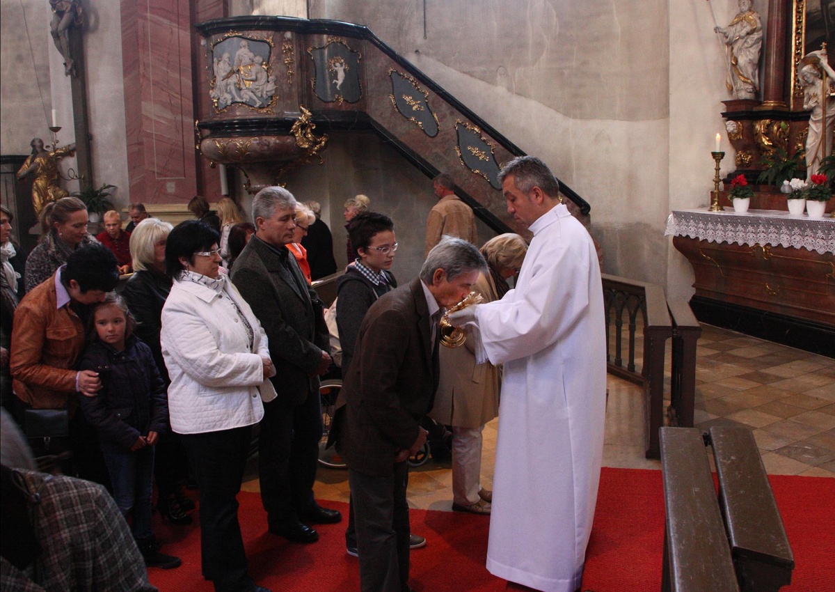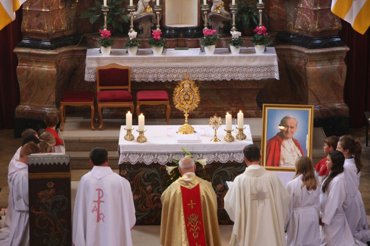 Im Rahmen eines festlichen Gottesdienstes stellte der Delegat der polnischen Missionen in Deutschland, Prälat Stanislaw Budyn, der polnischen Gemeinde das Erinnerungszeichen an den beliebten Papst vor. Er bedankte sich am Ende des Gottesdienstes auch für die herzliche Offenheit der Stiftspfarrei für die polnische Gemeinde und ihren Traditionen. Die über 300 Gläubigen zeigten anschließend ihre Verehrung für das aus Polen stammende langjährigen Kirchenoberhaupt mit einem Kuss auf die goldene Monstranz.