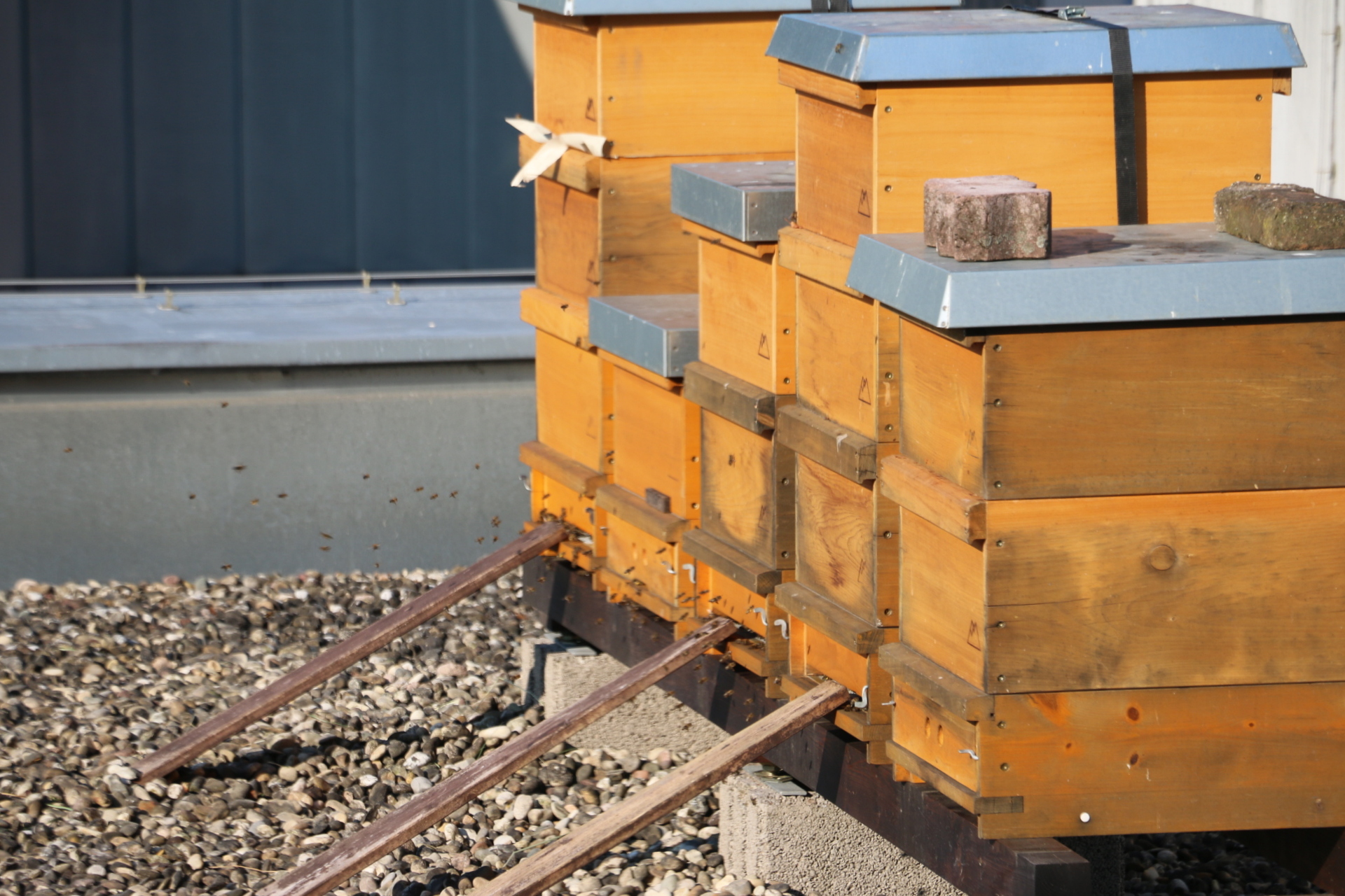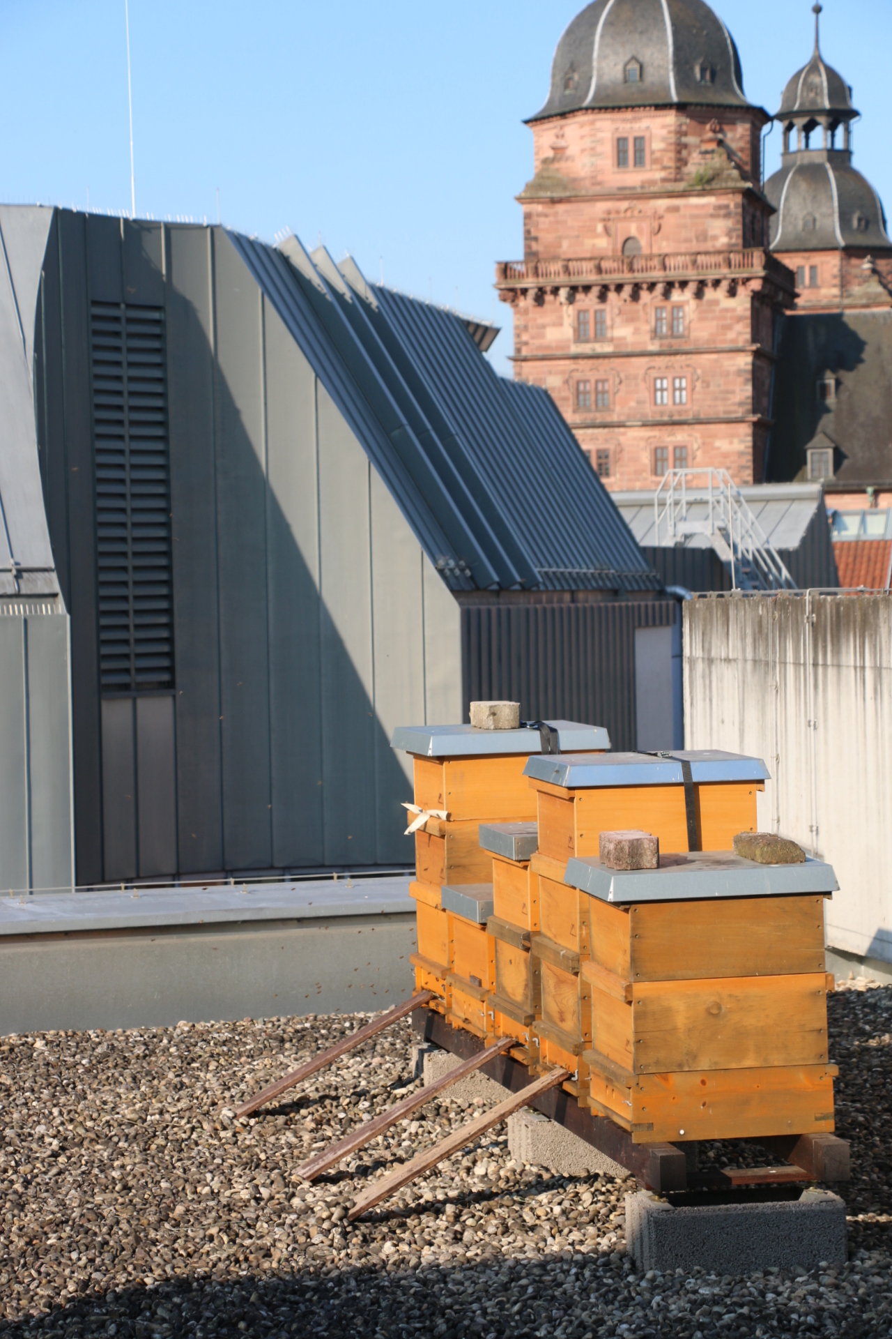Aschaffenburg (POW) In Kooperation mit dem Bienenzuchtverein Damm stehen seit Mitte Juni einige Bienenkästen auf dem Flachdach des Martinushauses in Aschaffenburg. Die Bienen werden vom Martinushaus bis zu fünf Kilometer ausschwärmen und überall, wo es im Stadtgebiet blüht, ihren Nektar suchen, Obstbäume bestäuben und Honig produzieren.