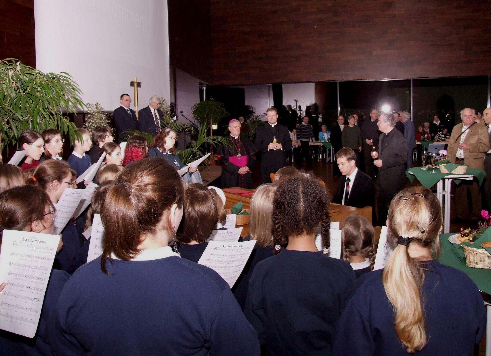 Beim anschließenden Neujahrsempfang im Martinushaus begrüßten die Pfarrgemeinderatsvorsitzenden Alfons Gerhart und Walter Engelhard die zahlreichen Gäste. Stiftskantor Andreas Unterguggenberger präsentierte die Arbeit der Stiftsmusik im Jahr 2007 und die Stiftschorknaben und -mädchen gestalteten die Begegnung musikalisch. Bischof Friedhelm Hofmann bekam als Dankeschön für seinen Besuch eine Torte mit dem Wappen des Papstes überreicht.