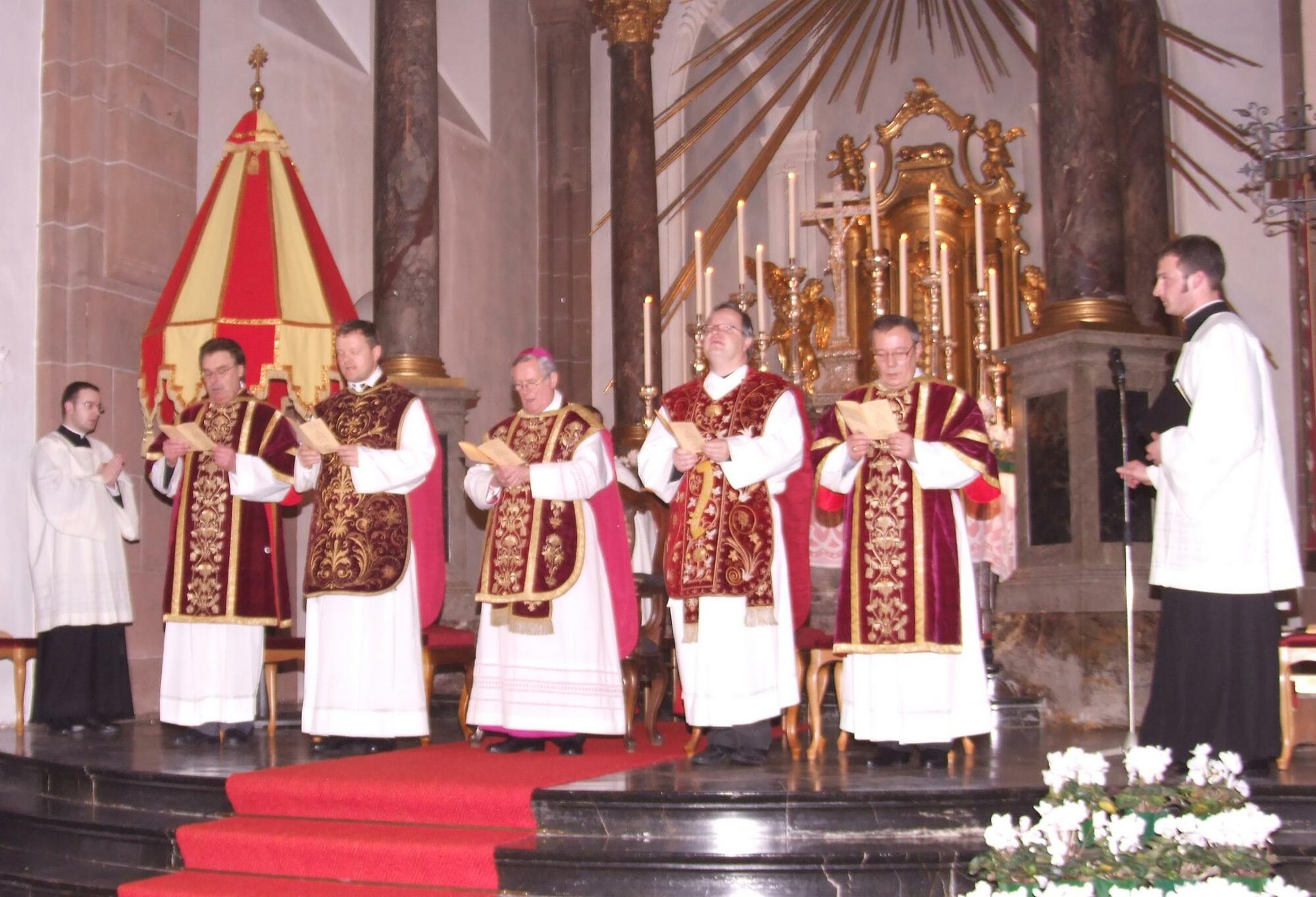 Doch auch die Verbundenheit der Menschen dieser Stadt mit der Kirche kommt mit dem Bild vom „beschirmt sein“ zum Ausdruck, wurde die Auszeichnung doch zur 1000-Jahr-Feier von Stadt und Stift Aschaffenburg im Jahr 1957 vom damaligen Papst Pius verliehen. In seiner Predigt lobte der Bischof die Stiftskirche als „in der Tat aus allen anderen Kirchen des Bistums herausragend.“ So strahlend, wie sie sich jetzt beim Jubiläum präsentiere, so der Oberhirte weiter, gebe sei auch ein weithin sichtbares Glaubenszeugnis für die ganze Region ab. Er führte aus, dass mit dem Ehrentitel auch eine Vorbildfunktion zusammenhängt, die sich in den Kunstschätzen, in der Feier der erneuerten Liturgie und in der Stiftsmusik zeige. Letztere glänzte an diesem Abend mit ihren Chören unter der Leitung von Andreas Unterguggenberger eindrucksvoll mit Werken von J.G. Rheinberger, Th. Dubois und G. Faurè .