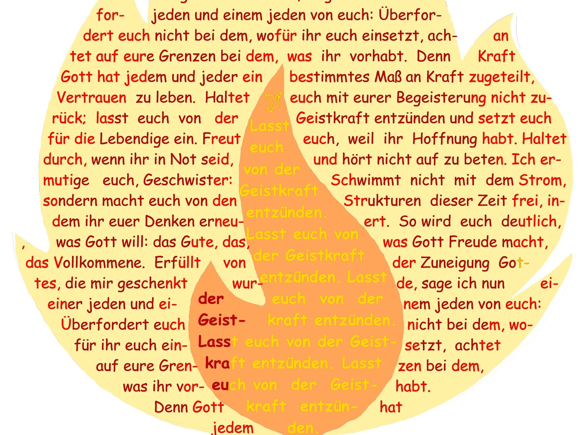 Wenn wir dieser Geistkraft Gottes trauen, wird Verständigung möglich über alle Barrieren hinweg, die wir zwischen uns aufgebaut haben. Der Geist Gottes führt Menschen zusammen und schafft Raum für Gemeinschaft und Miteinander – trotz und in aller Verschiedenheit.