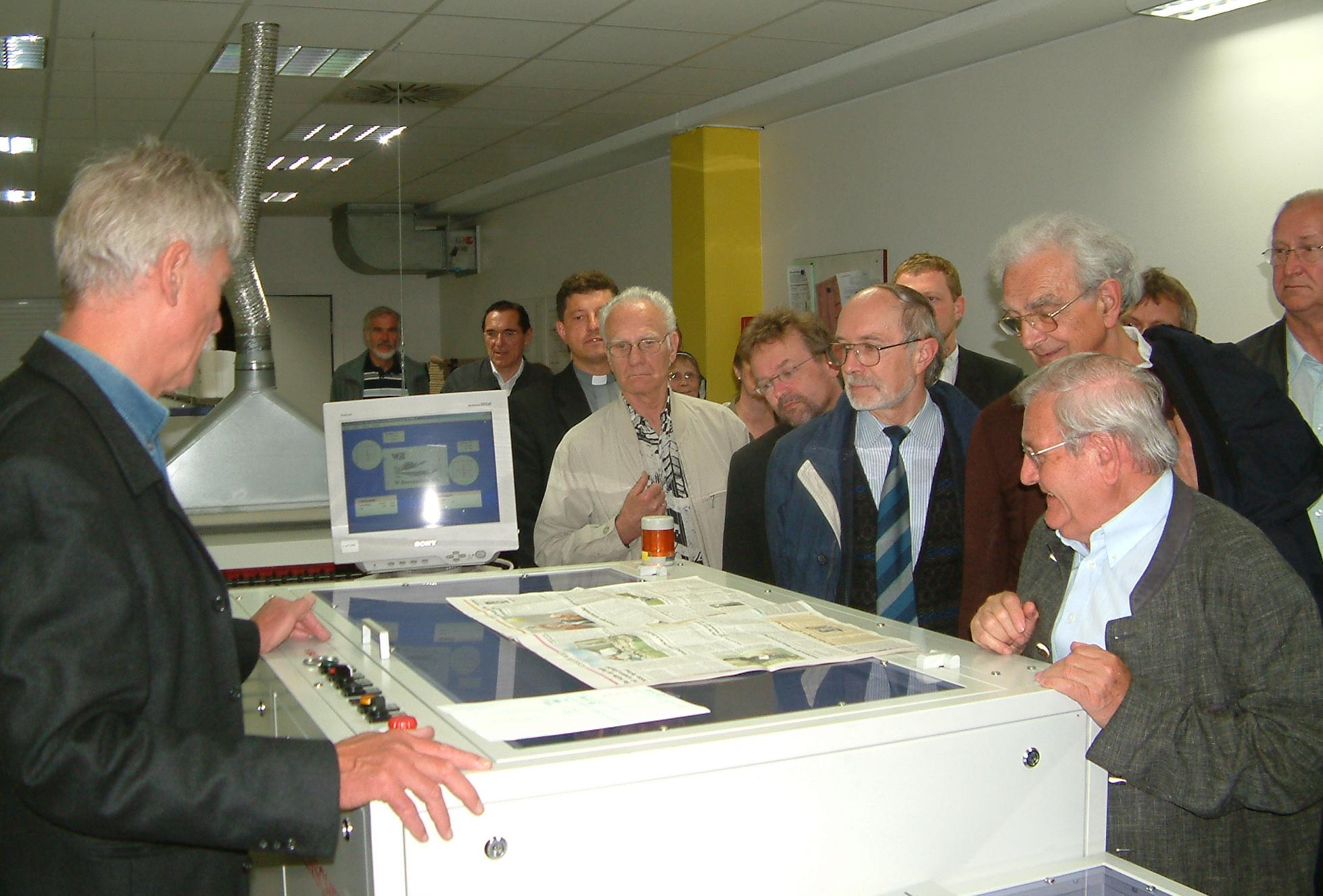 Die Besucher durften auf ihren Rundgang auch den neueingerichteten Raum für die Endredaktion bewundern. Dort arbeiten Redakteure und Techniker Hand in Hand, damit irgendwann zwischen 22.00 und 23.00 Uhr die große, dreistöckige Druckmaschine anlaufen kann. Das Main-Echo bemüht sich, die neue Zeitung bis spätestens 5.00 Uhr in die Briefkästen ihrer Abonnenten zu bringen. Dies ist ein hoher Anspruch, denn das Verbreitungsgebiet geht bis Wertheim, Miltenberg, Alzenau und Gemünden. Die Seelsorgekonferenz war an diesem Abend allerdings viel früher auf dem Laufenden: am Ende der Führung hielten die Teilnehmer ein frischgedrucktes Blatt in der Hand – allerdings die Marktheidenfelder Ausgabe.