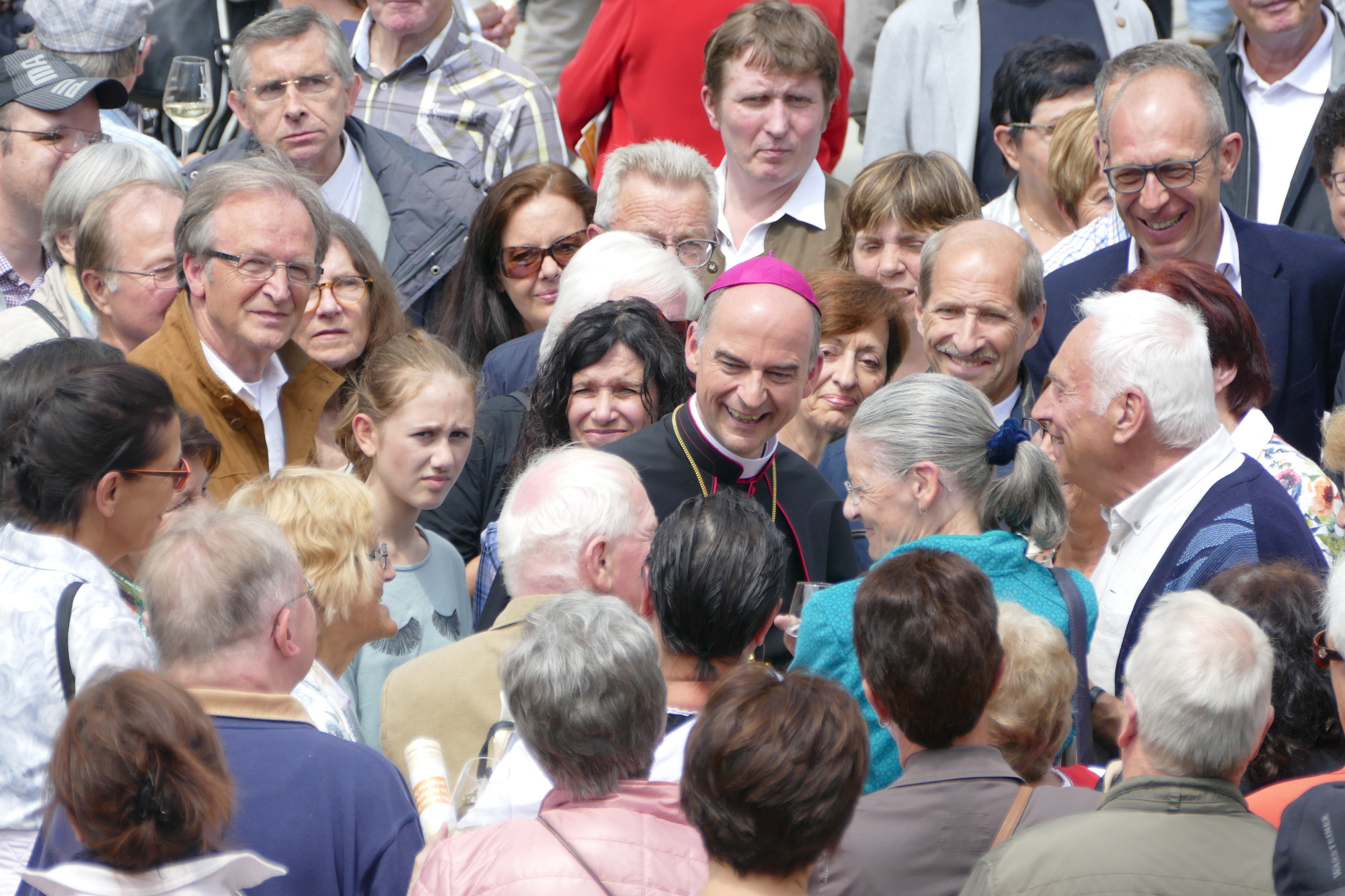 Im Anschluss an den Gottesdienst lud Dekan Kempf ganz nach kurmainzischer Tradition zu „Worscht, Weck und Woi“ auf den Theaterplatz ein. Dort nutzten viele der zum Teil weit angereisten Besucher die Gelegenheit, mit dem Bischof kurz ins Gespräch zu kommen oder ein Foto mit ihm zu machen. „Ich glaube, das ist ein charmanter Mensch. Und was er drauf hat, werden wir noch sehen“, beschrieb eine Frau ihren ersten Eindruck nach dem Gottesdienst. Ein Pfadfinder aus der Fahnenabordnung fand es angenehm überraschend, dass der Bischof so gerne lache und den Gottesdienst offensichtlich genossen habe. Manche merkten auch an, dass sie sich konkretere Äußerungen zur Zukunft der Kirche am Untermain gewünscht hätten und dass der Gottesdienst eine sehr traditionelle Form gehabt habe. Das Fazit eines anderen: „Lockere Atmosphäre, sehr positive Impulse. Ich fühle mich im wahrsten Sinne des Wortes gestärkt."