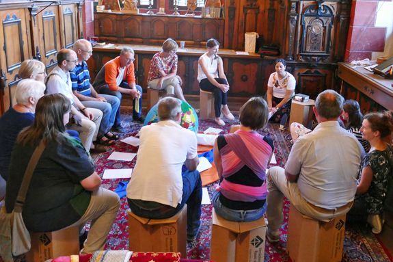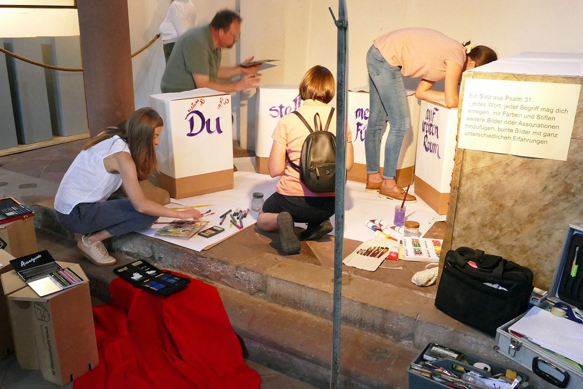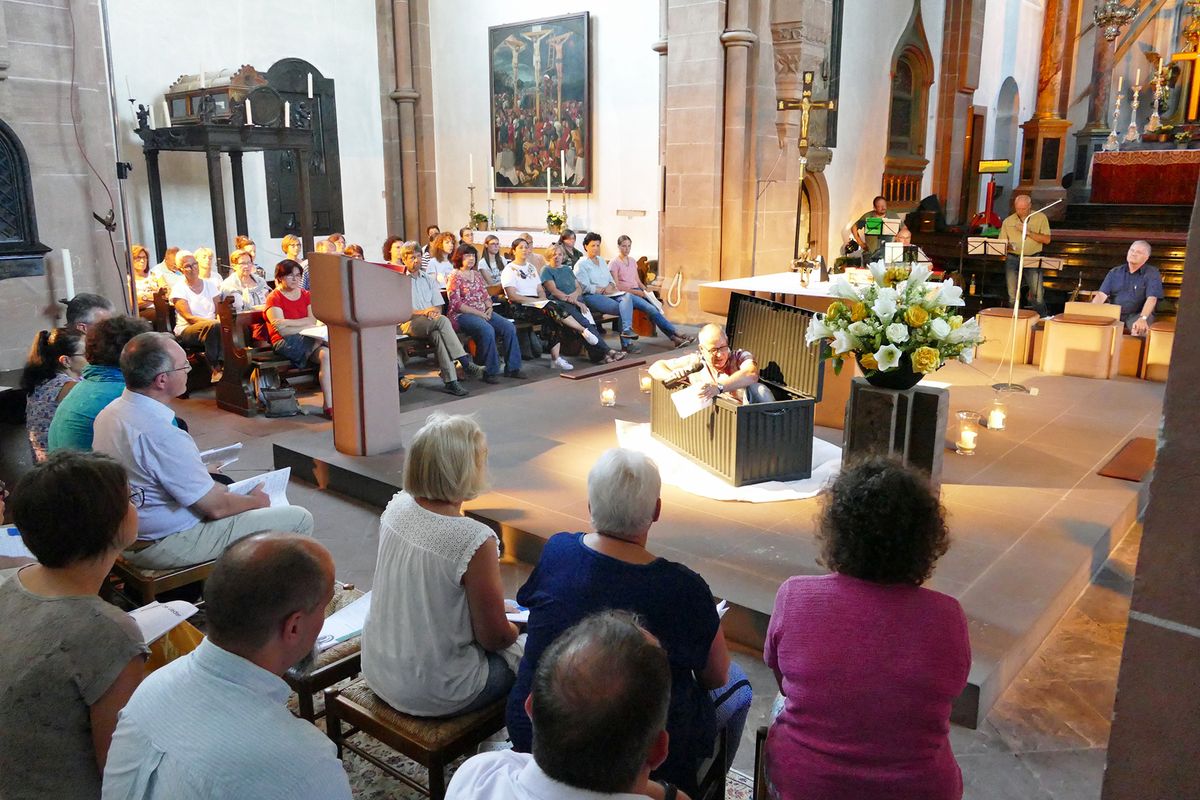 Erfahrungsorientiert startete auch der Jubiläumsgottesdienst. Um Weite spürbar zu machen, zwängte sich Teammitglied Wolfgang Grose, Leiter des Sozialkaufhauses der Diakonie in Aschaffenburg, zunächst in eine enge Kiste. „Man muss etwas wagen, um aus der Enge auszusteigen“, formulierte er mit Blick auf Krisengebiete in der Welt, aber auch auf persönliche Beziehungen, in denen es manchmal im übertragenen Sinn eng wird, und stieg nach und nach aus der Kiste. Zum Konzept des Gottesdienstes gehört das Angebot verschiedener Erfahrungsräume, in denen die Teilnehmer selbst ausprobieren können, was das Thema für sie bedeutet. Diesmal standen Erfahrungswege, Mal-, Schreib- und Tanzstationen zur Auswahl. Eine Gruppe beschäftigte sich mit dem aktuellen Thema „Schöpfungsverantwortung übernehmen“.