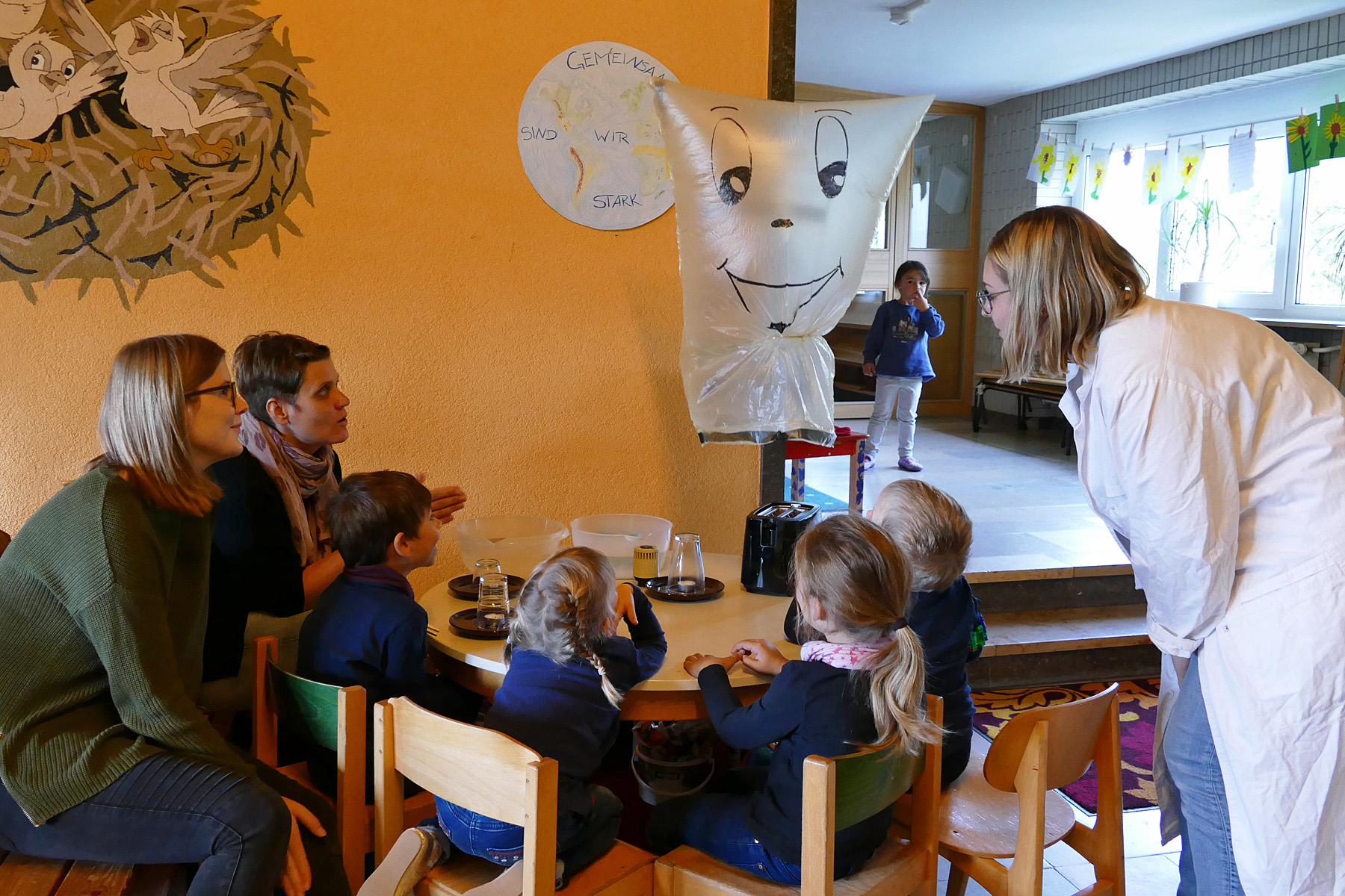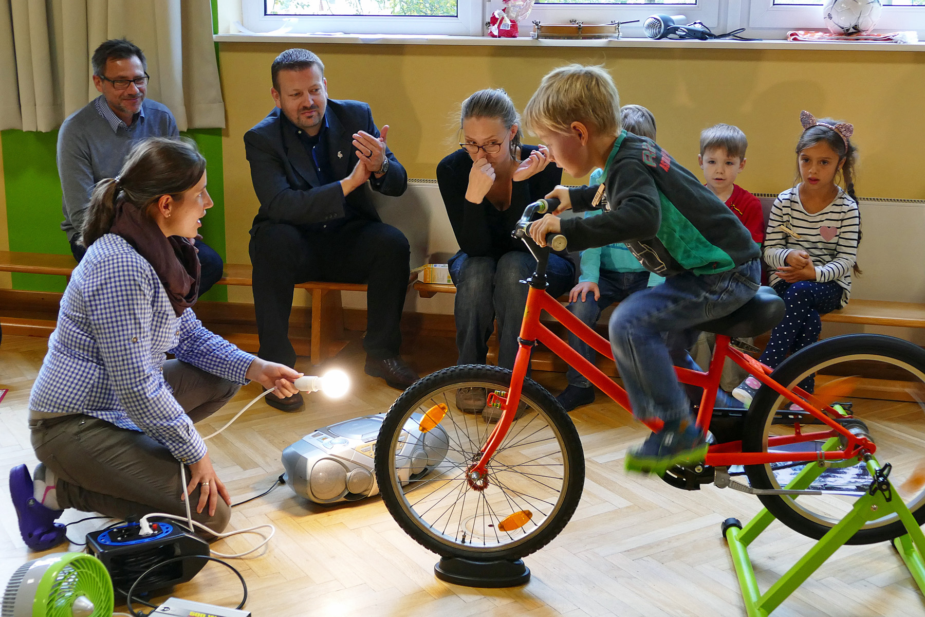 „Es geht bei unseren Besuchen um das Thema Energiesparen im Allgemeinen, um das richtige Heizen und Lüften, um Müllvermeidung und was wir überhaupt tun können, um die Schöpfung zu bewahren“, erklärt Projektkoordinatorin Julia Stubenrauch. Damit es für die Kinder nicht langweilig wird, kommt sie mit pädagogisch versierten Energietrainerinnen in die Einrichtungen. Diese vermitteln die Themen in Kleingruppen möglichst lebendig. Da gibt es nicht nur spannende Erfahrungen mit dem „Toast-Geist“. An einer anderen Station wird beispielsweise ein Energiefahrrad aufgebaut. Wenn die Kinder darauf genügend strampeln, können sie einen Fön zum Laufen und eine Glühbirne zum Leuchten bringen. Das ist zwar anstrengend, macht aber trotzdem allen Spaß.