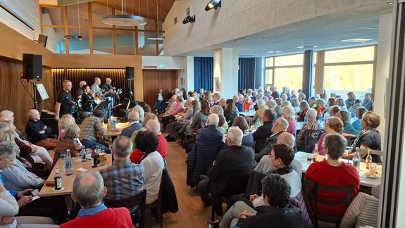 Mit Begeisterung sangen und klatschten die Besucherinnen und Besucher des Konzertes mit. Als das Mottolied als Zugabe wiederholt wurde, nahmen sie den Refrain wörtlich und standen tatsächlich auf. Zwischen den Liedern gab es immer wieder Texte aus der Kolumne „Moment Mal“, die mittwochs im Main-Echo erscheint und mit der Vogt Lebens- und Glaubensfragen aufgreift. In der Pause lud das Roncalli-Team zu einem reichhaltigen Tapasbuffet ein, das von den ehrenamtlichen Mitarbeitern liebevoll gekocht und aufgebaut worden war. „Das war eine wirklich runde Veranstaltung, die Lust auf den Katholikentag gemacht hat“, fasste eine Teilnehmerin den Abend zusammen.
