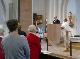 Aschaffenburg (POW) Viel ist bei der zehnten „Nacht der offenen Kirchen“ in Aschaffenburg am Samstagabend, 28. September, los gewesen. Geschätzte 1000 Besucher schlenderten zwischen 18 und 23 Uhr durch die Innenstadt und ließen sich an den 13 Veranstaltungsorten von den zahlreichen Angeboten inspirieren. So gab es beim ökumenischen Eröffnungsgottesdienst in der Sankt-Agatha-Kirche von Pfarrerin Ulrike Gitter und Gemeindereferentin Eva Meder-Thünemann Impulse zur Frage, was die Menschen trotz aller Unterschiedlichkeiten miteinander verbindet. Die Teilnehmer konnten am Ende Bänder in ein Netz einweben ̶ als Zeichen dafür, dass sie gehalten sind von Gottes Band des Friedens. Erstmals dabei war die Neuapostolische Gemeinde, die anschließend in dieser Kirche einen Gebetsparcours aufgebaut hatte und zu einem Begegnungscafé einlud. Nebenan im Martinushaus begeisterte die Musik der Elsenfelder Band „Klezmusica“ die Besucher. Im Anschluss erfuhr man dort etwas über den Aschaffenburger Stadtpatron und Namenspatron des Hauses Sankt Martin. Dazu gab es einige Kostproben aus dem Martinus-Musikspiel, das am 9. und 10. November wieder aufgeführt werden soll und für das es jetzt schon Karten im Vorverkauf gibt.