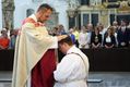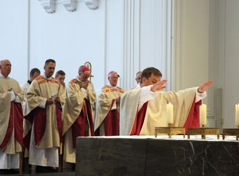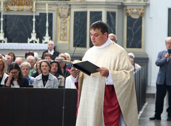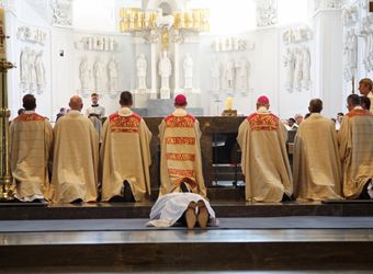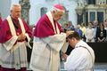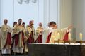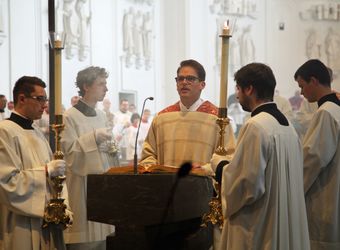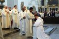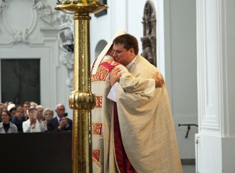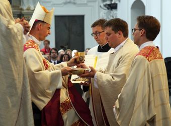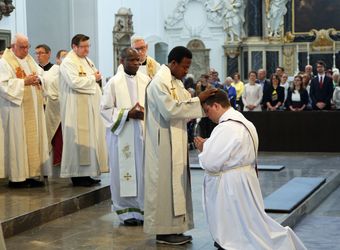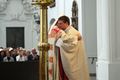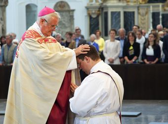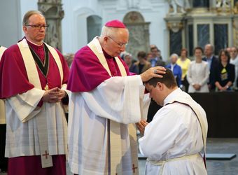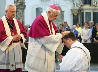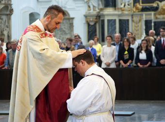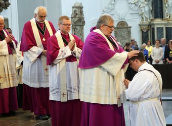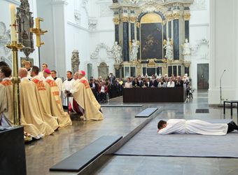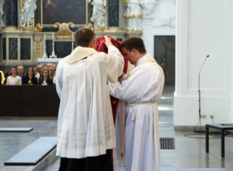 Bei der Anrufung der Heiligen lag der Weihekandidat ausgestreckt am Boden und zeigte seine Bereitschaft, sich Gott ganz hinzugeben. Dann legten ihm Bischof Jung, Bischof em. Dr. Friedhelm Hofmann, Weihbischof Ulrich Boom, Weihbischof em. Helmut Bauer sowie rund 50 Priester aus der ganzen Diözese Würzburg die Hände auf – seit urchristlicher Zeit Zeichen für die Beauftragung und Bevollmächtigung. Im Weihegebet bat Bischof Jung schließlich um den Geist Gottes für den Neupriester. Als „ausdeutende Zeichen“ der Weihehandlungen zog Pfarrer Dr. Christian Grebner, Leiter der Pfarreiengemeinschaft „Sankt Katharina Ernstkirchen – Sankt Josef Kleinkahl“, dem Geweihten die priesterlichen Gewänder an, salbte ihm Bischof Jung die Hände, überreichte Kelch und Hostienschale und umarmte ihn zum Friedensgruß.