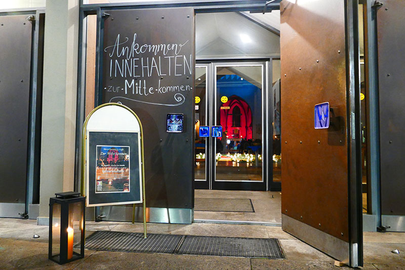 Im Zentrum der Kirche stand 21 Tage lang ein großes Lichterlabyrinth. 130 brennende Kerzen empfingen die Besucher der Kirche und luden ein, sich auf einem Lichtweg in die Mitte zu begeben und dort einen Segensspruch aus einem Schatzkästchen zu nehmen. Das Labyrinth war täglich von 17 bis 20 Uhr erleuchtet. „Immer wieder ging die Türe auf, Leute kamen herein, sahen und staunten“, erzählt Robert Flörchinger, der die Organisation des Angebots übernommen hatte.