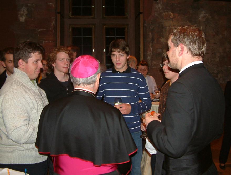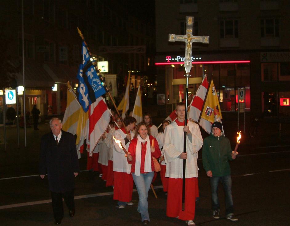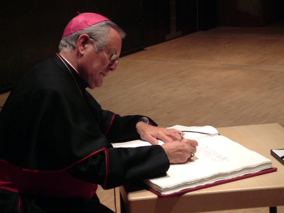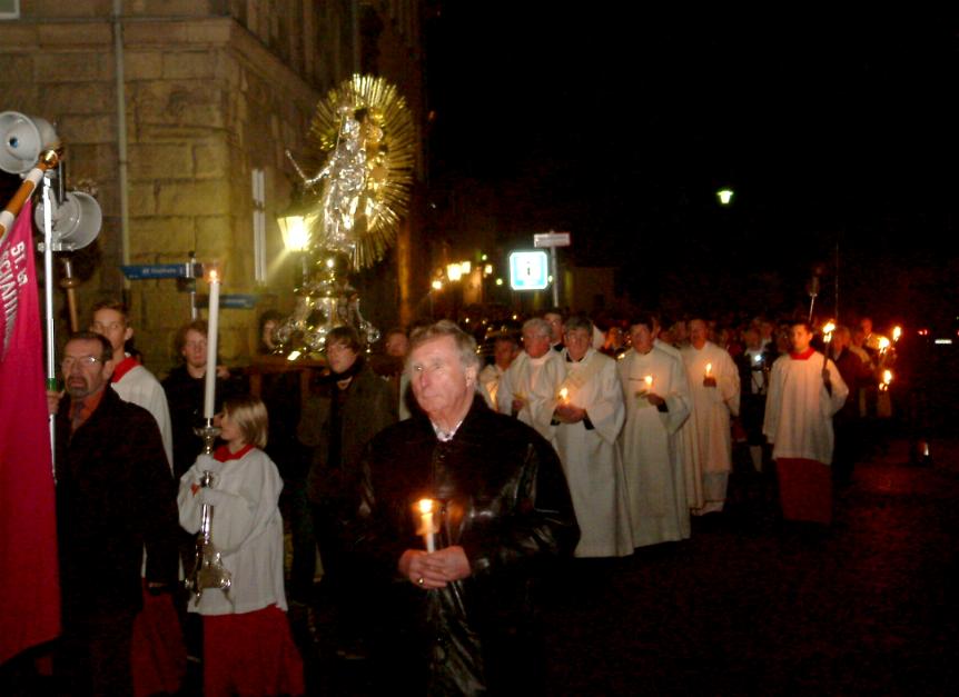 Der Gottesdienst wurde musikalisch einfühlsam von den Stiftschorknaben und –mädchen unter der Leitung von Stiftskantor Andreas Unterguggenberger umrahmt. Die anschließende Prozession wurde von der Mainaschaffer Blaskapelle begleitet. Am Ende spendete der Bischof vom Balkon des Schlosses den Segen. Beim anschließenden Empfang im Ridinger-Saal wurde er von Oberbürgermeister Klaus Herzog herzlich begrüßt. Er betonte, dass es in Aschaffenburg eine lange und gute Tradition gebe, dass Stadt und Kirche gemeinsam viele Aufgaben angehen. Er lud den Bischof ein, sich in das Goldene Buch der Stadt Aschaffenburg einzutragen. Hofmann tat dies mit den Worten: „Am Abend eines denkwürdigen Tages erstrahlt Aschaffenburg im Lichterglanz vieler Wallfahrtskerzen. Möge Gott diese Stadt mit ihren Bewohnerinnen und Bewohnern immer segnen.“