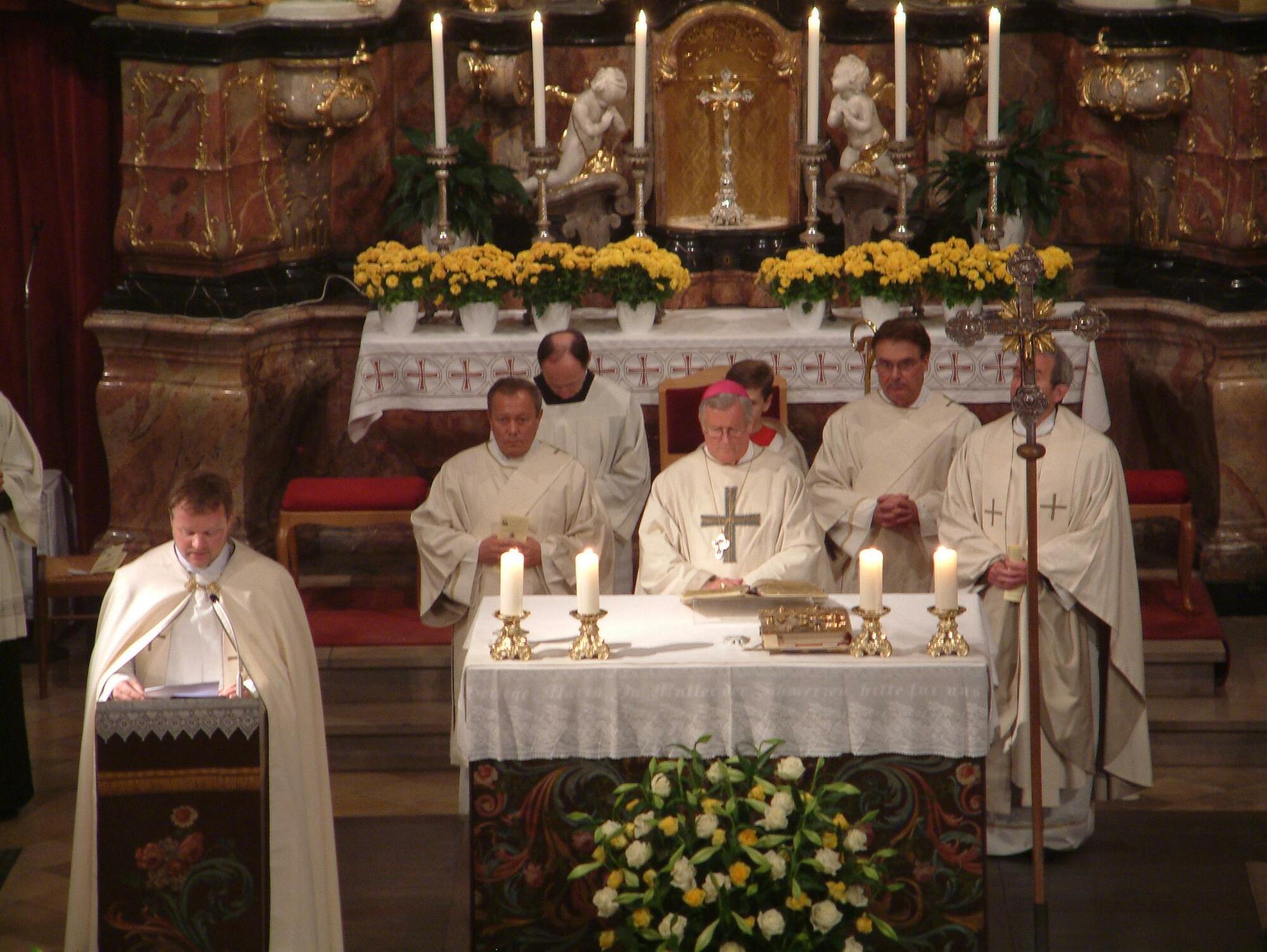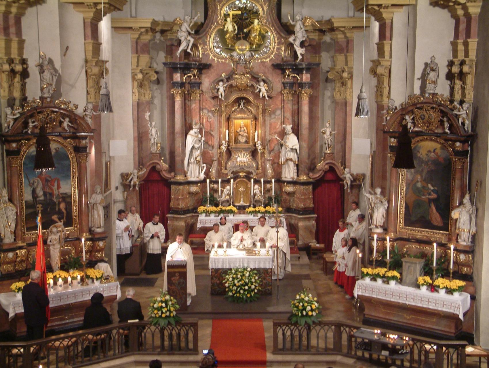 Der Würzburger Bischof Friedhelm Hofmann hielt zuvor ein Pontifikalamt in der voll besetzten Kirche am Sandtor. Für Gläubige, die keinen Platz mehr gefunden hatte, wurde der Gottesdienst auf einen Bildschirm ins Freie übertragen.