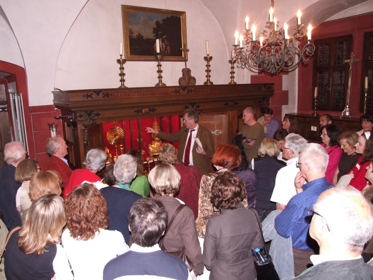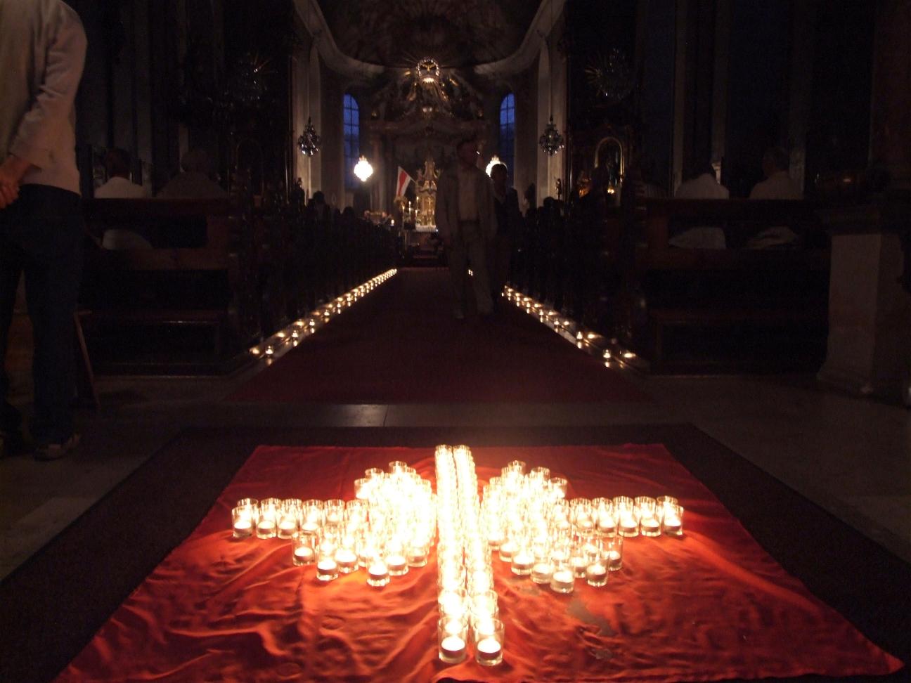 Als ein spirituelles Zentrum erwies sich nun zum dritten Mal die Taizè-Kirche in St. Agatha. Den ganzen Abend über suchten dort zwischen ein- und zweihundert Menschen Stille und Sammlung in der mit hunderten von Kerzen geschmückten Kirche. Von dort aus ging es auch hoch hinaus: die Turmbesteigungen zur Glocke von 1478 mit Pater Arnold Hartlaub waren beide Male ausgebucht. An Kapazitätsgrenzen kamen auch die Führungen zum Stiftsschatz in der Stiftsbasilika. Zweimal drängten sich gut 60 Menschen in der Sakristei vor den silbernen Büsten von St. Peter und St. Alexander.