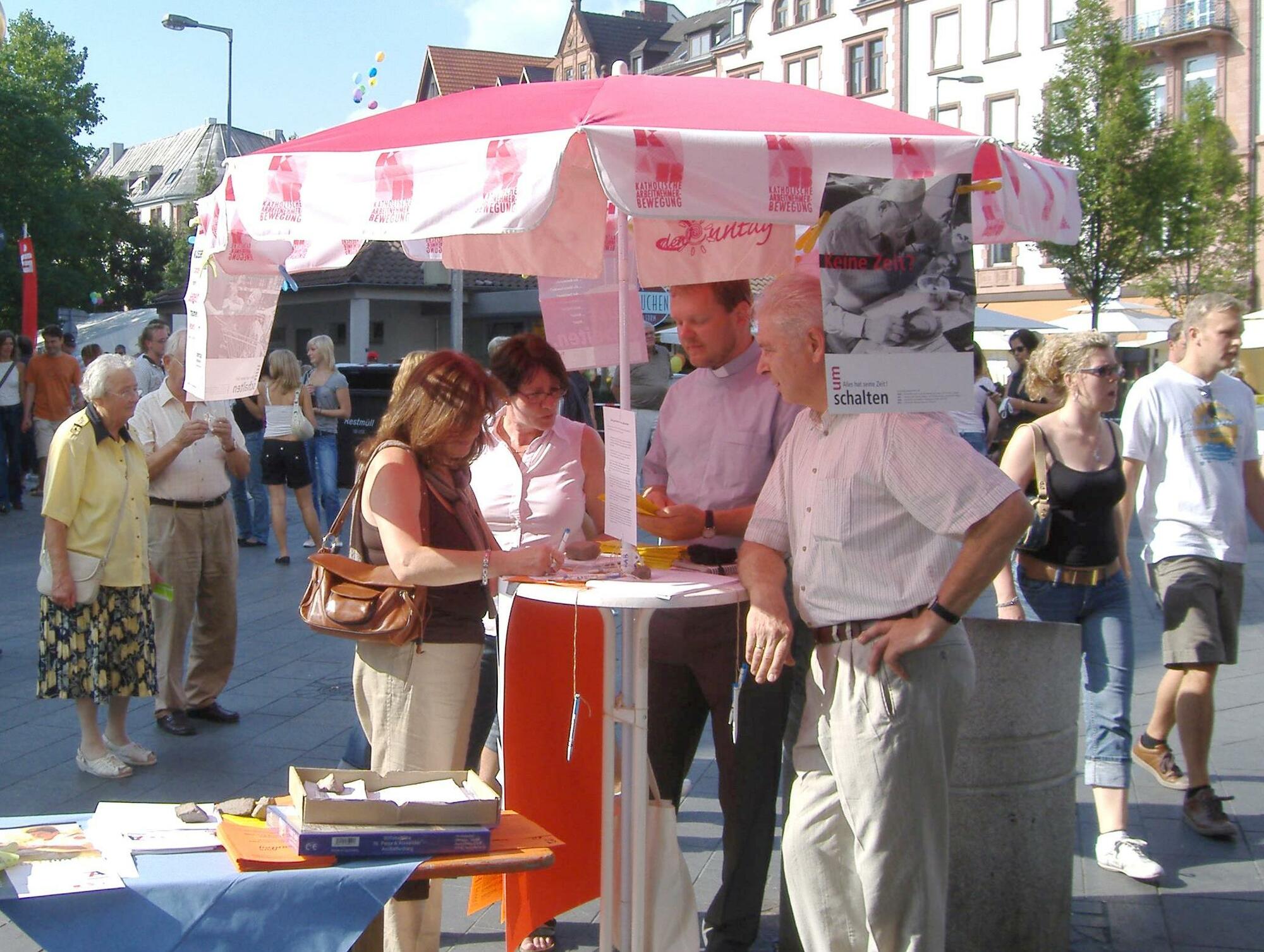 Mitten im Trubel des Stadtfestes ging es den Standbetreibern auch um einen positiven Blick auf den Sonntag. So sprang ein Plakat mit der Frage „Wann wollen sie küssen, frühstücken, beten, träumen, lieben ... wenn nicht Sonntags?“ ins Auge. Mit einem Flyer machte die KAB unter dem Motto „Sonntags Langeweile – nicht bei uns!“ auch auf ihr Familienprogramm aufmerksam.