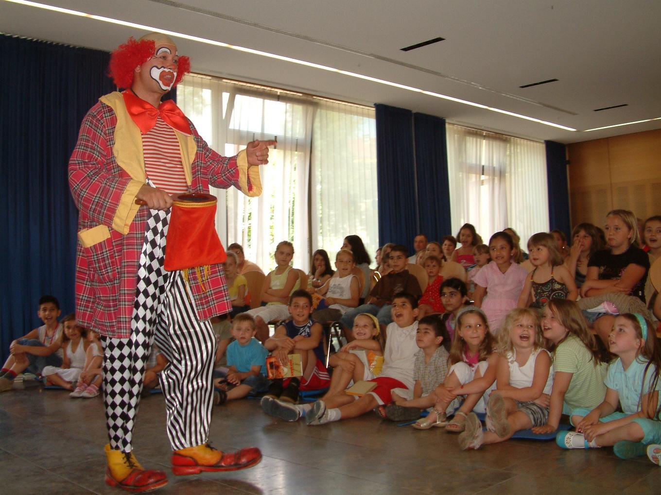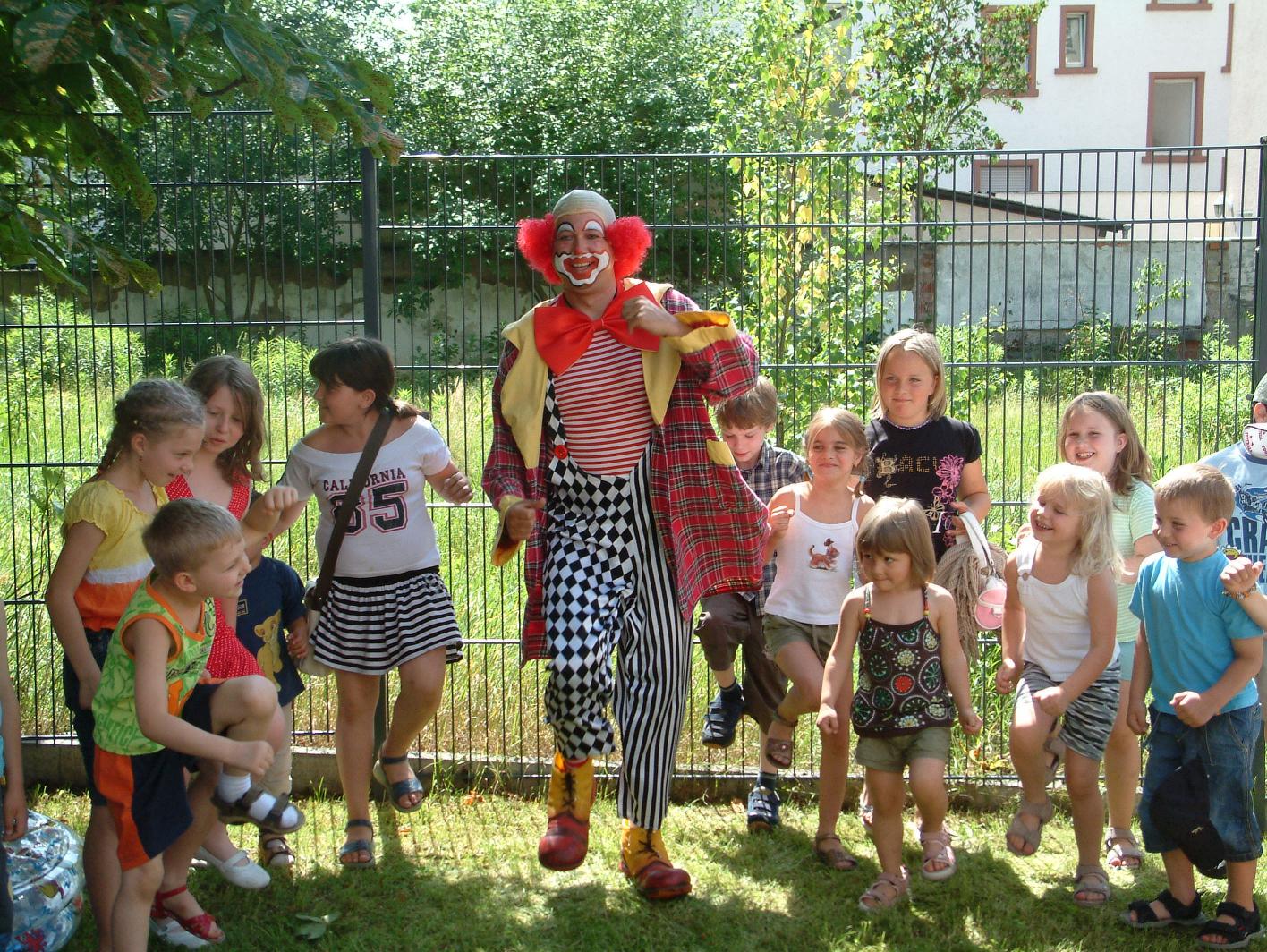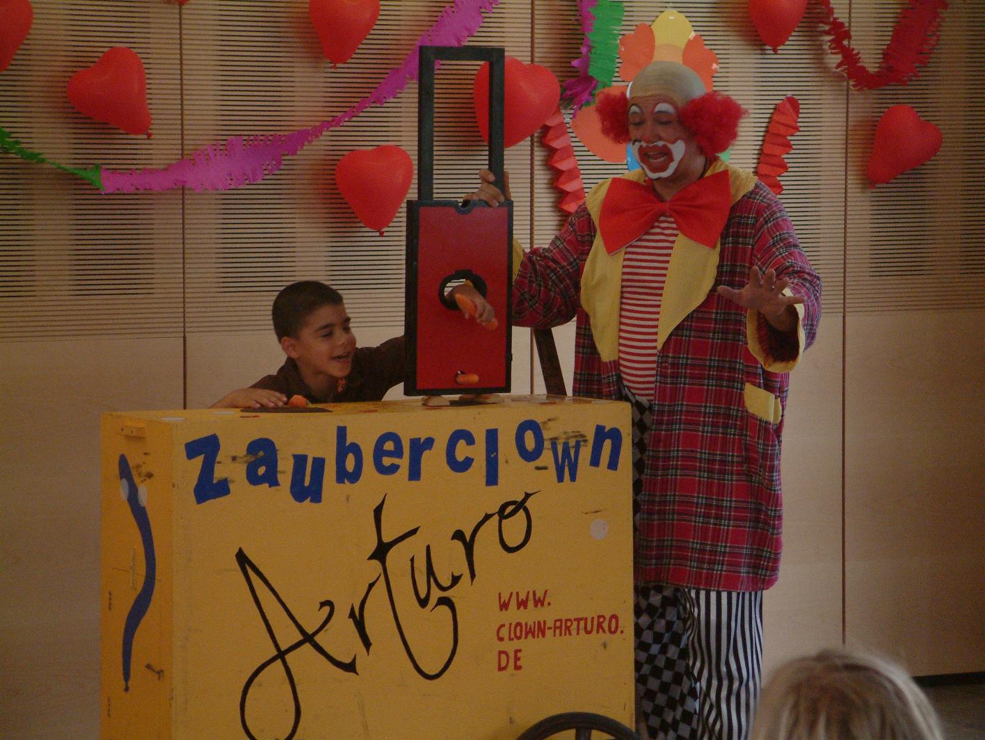 Nach der Zaubershow gab es noch so einiges zu erleben. Mit Pfarrer Friedbert Simon gab es eine Entdeckungstour durch die Kirche. Er erklärte dem bunt zusammengewürfelten Haufen von Kindern verschiedener Konfessionen und Religionen in ganz einfacher Sprache alles wichtige rund um die Einrichtung einer katholischen Kirche. Viele konnten zum ersten Mal einen Blick in eine Sakristei werfen und eine Orgel bestaunen. Im Pfarrheim konnte man malen oder basteln, tanzen oder Theater spielen. Ein Sinnesparcour der Pfarrjugend aus der Nachbarpfarrei St. Michael lud zum Fühlen, schmecken und riechen ein und wer es lieber sportlich mochte, konnte sich mit Rasen-Ski und Sackhüpfen austoben. Am Ende des Nachmittags gab es eine Tanzvorführung und anschließend ein Zauberfinale mit dem Clown Arturo. Ein Bonbonregen versüßte den Abschluss des Festes im Haus der Begegnung.