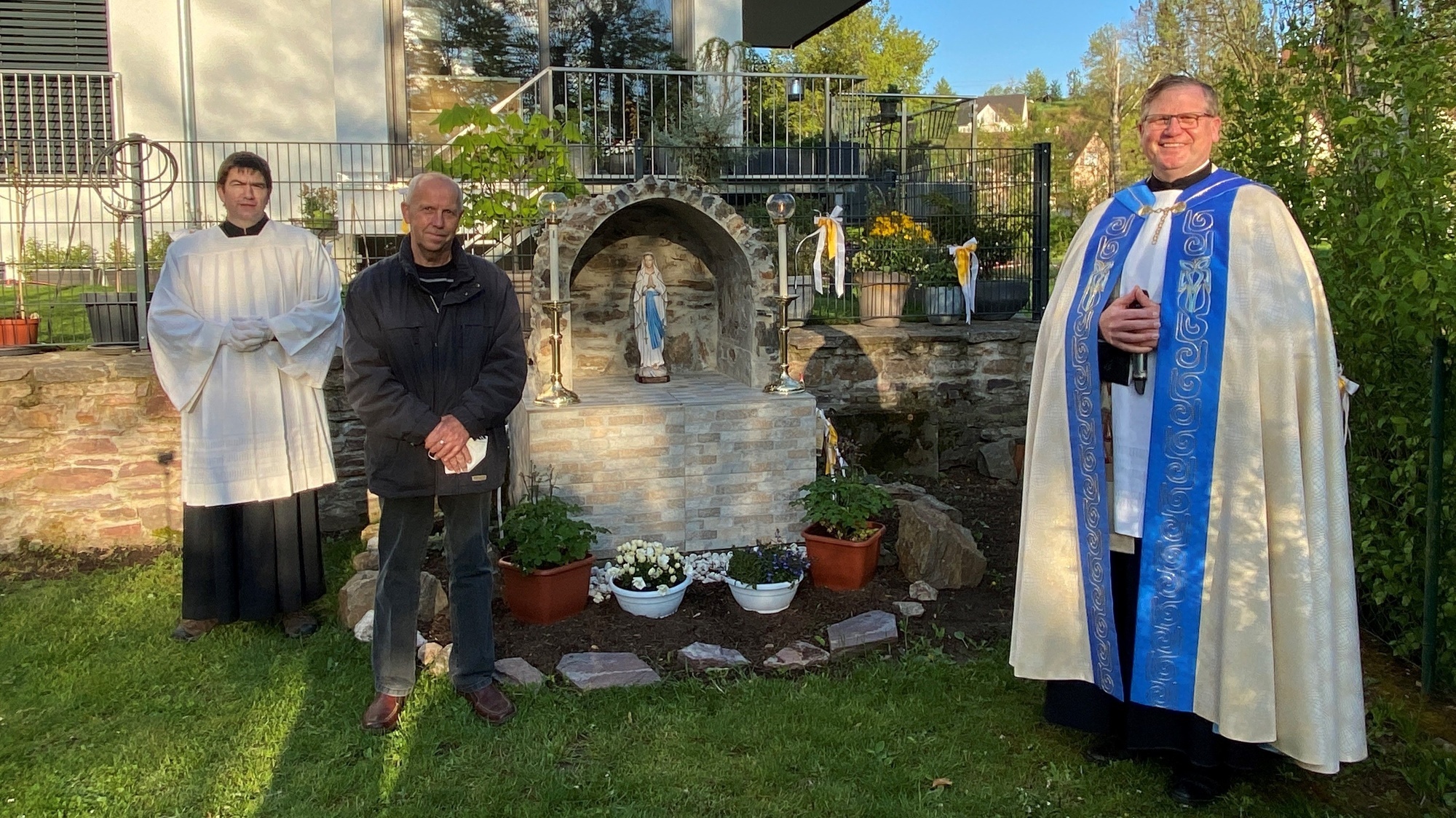 Die Arbeiten für die Grotte wurden unter Regie von Diakon Ludwig Wallinger begonnen und ruhten nach dessen plötzlichem Tod im September 2019. Diakon Helmar Brückner vollendete die Bauarbeiten. Pfarrer Mathiowetz sprach Diakon Brückner ein „Vergelts Gott“ aus und schloss den verstorbenen Diakon Wallinger besonders ins fürbittende Gebet ein. In seiner Ansprache erinnerte Mathiowetz an die Botschaft von Lourdes und die Bedeutung des südfranzösischen Marienwallfahrtsortes. Dort berühre der Himmel die Erde. Lourdes sei ein Gnadenort, an dem viele Menschen an Leib und Seele gestärkt würden. Die Gottesmutter Maria führe die Menschen zu Christus, dem Heiland, und sage zu ihnen wie bei der Hochzeit von Kana „Was er euch sagt, das tut“, betonte Pfarrer Mathiowetz in seiner Predigt. Die Maiandacht wurde mit einem Bläserquartett aus Hörstein mit Marienliedern feierlich umrahmt. Hans Bretschneider fungierte als Kantor. Im Anschluss an die Marienandacht gab es für die Gottesdienstbesucher eine Maibowle „to go“. Die Andacht fand gemäß der Hygiene- und Abstandsregeln statt.